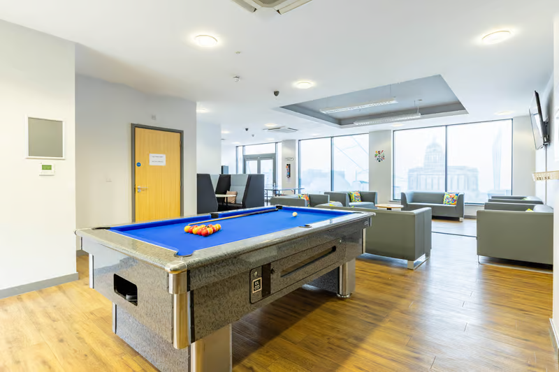 房间内部:房型丰富,涵盖 4/5/6 床独立卫浴套房及标准 / 大型 / 超大号 studio,均配电视、舒适床、书桌及储物空间,暖气齐全,满足合租或独居需求。公寓设施:实用配置拉满!专属自习区专注赶 due,游戏区有台球、乒乓球桌解压;24 小时驻场维护团队响应及时,有问题不用等。含财产险、洗衣房、安全自行车存放处,200Mbps 高速网覆盖,全包账单无额外开销,CCTV 保障安全。