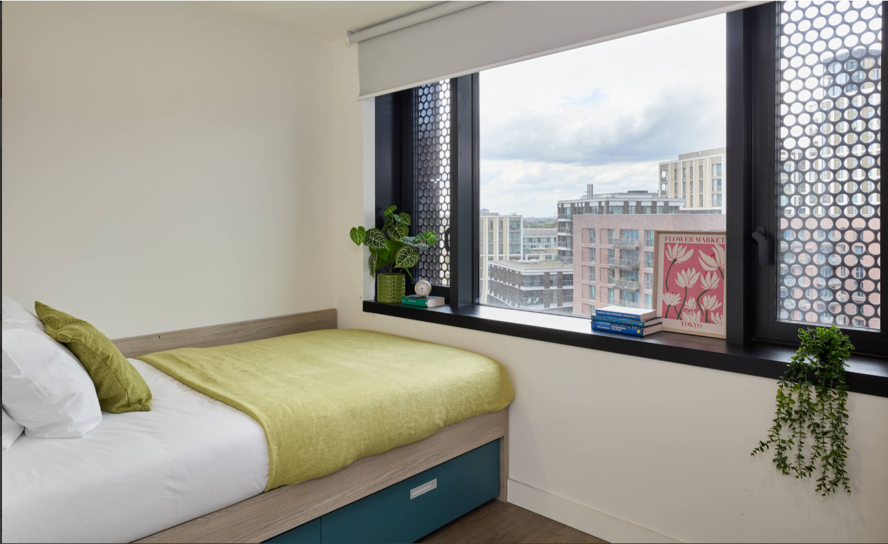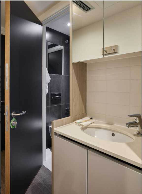 房间内部:有独立卫浴单间、共享卫浴单间和 Studio 可选,适配不同需求~ 记忆棉床垫睡起来超舒服,嵌入式书桌 + 充足储物空间,学习收纳两不误。全屋带冷暖系统,四季都宜居,还有空气过滤和降噪设计,网课、休息不被打扰,厨房家电(冰箱、烤箱、洗碗机)齐全,做饭超方便~公寓设施:安全感拉满!24 小时驻场支持 + 电子门禁 + CCTV,有问题随时找工作人员。健身房下楼就能锻炼,公共休闲区适合和朋友小聚,自习室安静不吵闹,还有洗衣房、自行车存放处,生活需求全满足~ 按 Passivhaus 标准建造,节能环保,空气质量好,过敏体质也能安心住~
