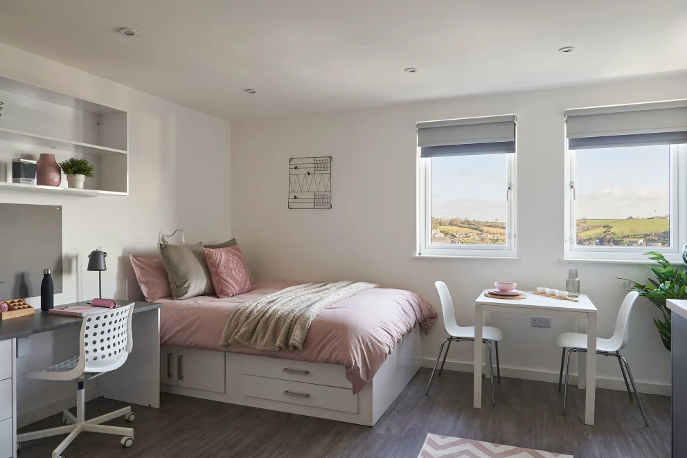 The Quarry - Falmouth位于法尔茅斯镇中心东侧的山坡上,是一处视野开阔的学生公寓。每天回到房间时,透过窗户看到的那些错落有致的屋顶和远方的海平面,清晨沿着下坡路慢跑到Gyllyngvase海滩看日出,课后在镇中心的独立咖啡馆里寻找创作灵感,充满生活的气息。