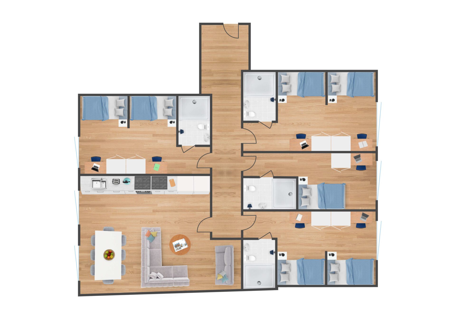 房间内部:涵盖独立卫浴套间、两居室公寓及单人/双人 Studio,空间宽敞不压抑。床型舒适,房间通透,高速WiFi满格覆盖,厨房设施齐全,煮面煲汤都顺手,轻松实现“留学生干饭自由”。