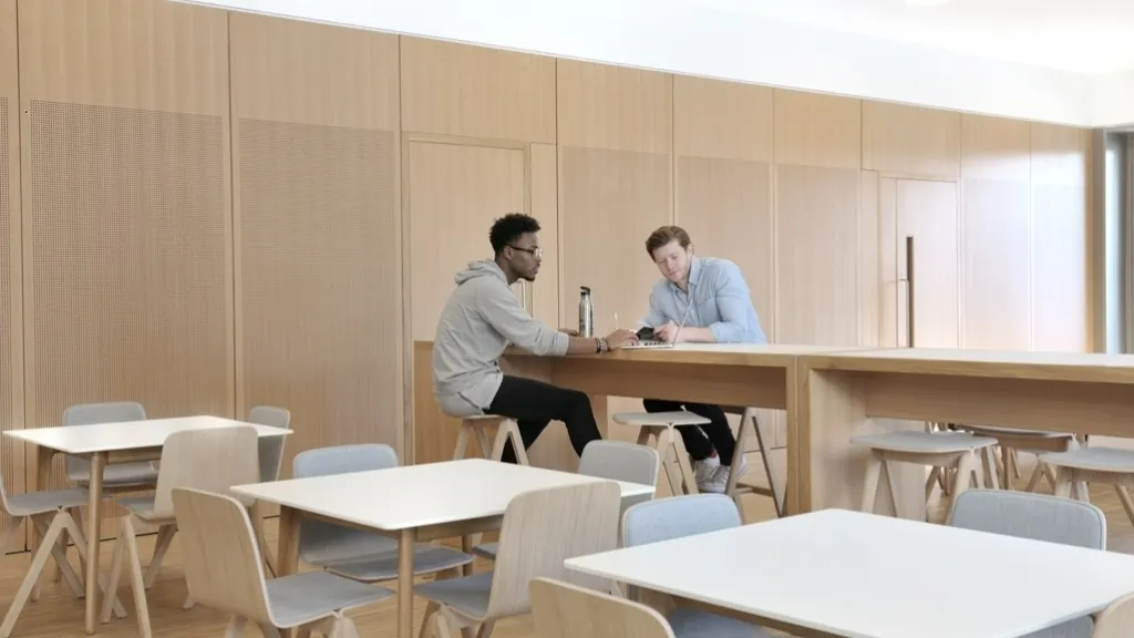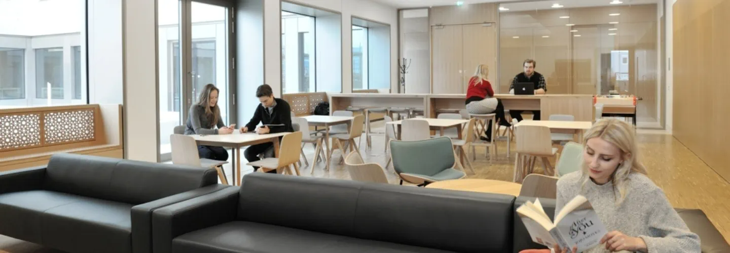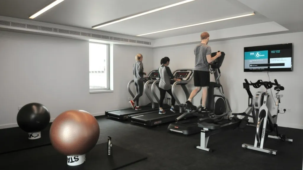 1-2层设社交休息室、自习室与庭院花园;9层有健身房及露台,还有洗衣房、电梯与无障碍设施,学习娱乐两不误。