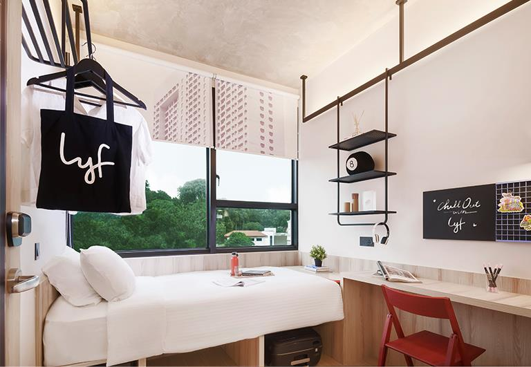 坐落经过翻新的时髦的Funan购物中心的顶部,这是一个生活空间,拥有时髦的客房和便利设施,是目前东南亚最大的共享居住空间。Lyf(发音与’life’相同),Ascott集团 —— 千禧时代,首次以Lyf品牌开设共享公寓,要提供富有活力的“生活—工作—玩乐”空间,也满足千禧时代对社交联系、协作与共创的兴趣。Lyf福南共享公寓占地12万1000平方尺,占据福南综合项目9层楼的空间,里头的279间公寓共有412个设计现代的房间。