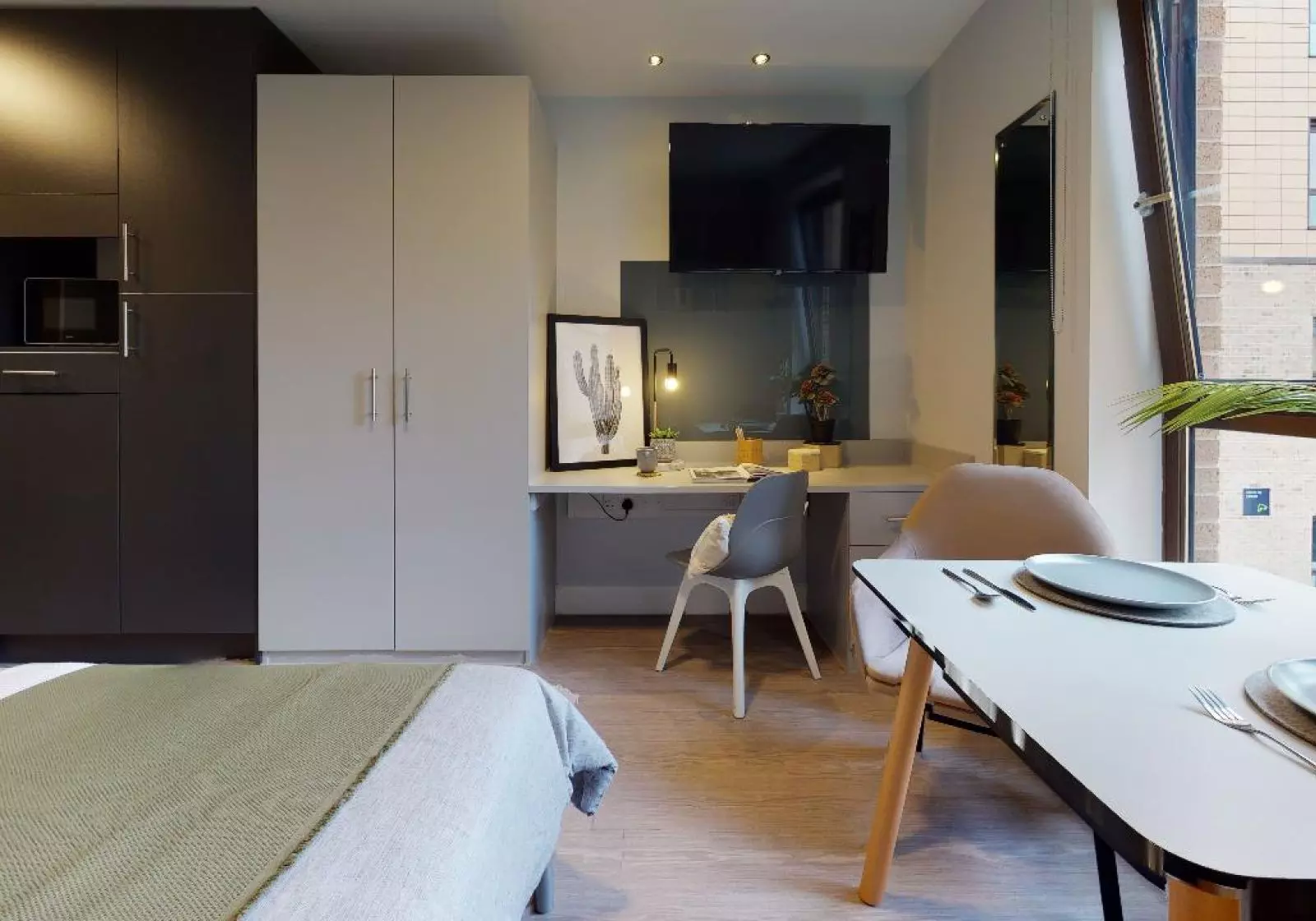 标准的Studio房间,配备小双人床,全套家具,精装修房间,带独立厨房