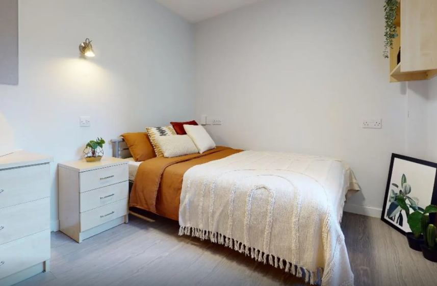 公寓主打 Ensuite 和 Two Bed 两种房型,满足不同居住需求。Ensuite 为独卫设计,4-6 人共享厨房,社交与私密空间兼顾;Two Bed 是两室一卫一厨的套间,厨房与卧室分区明确,通风效果佳,能有效避免油烟干扰。所有房间均配备小双人床、实用衣橱和书桌,且装有暖气,为日常居住和学习提供舒适基础。