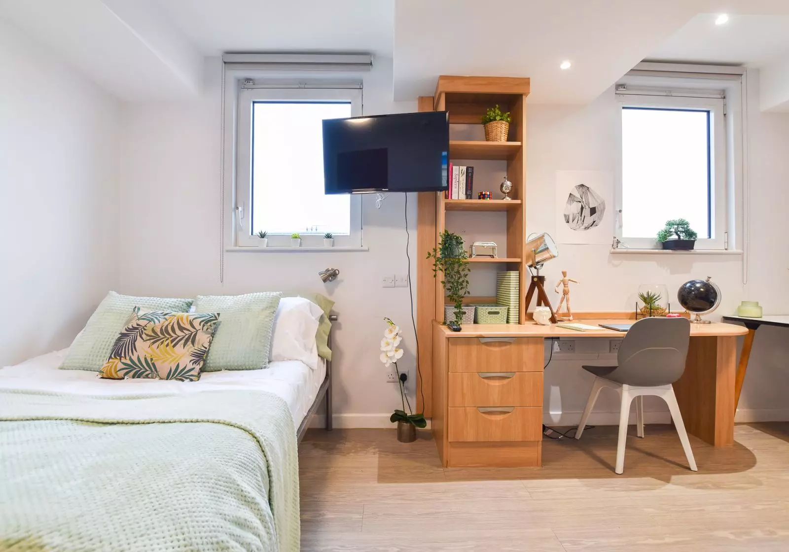 房间内部涵盖多种房型,满足不同需求:Ensuite 房型分 Bronze Ensuite 和 Bronze Ensuite Plus,均配备独立卫浴,3-6 人共用厨房,性价比突出;Studio 房型从 Bronze 到 Platinum 六个等级,按面积和楼层划分,独卫独厨设计,私人空间充足;Two bed 房型适合双人入住,卧室与厨房分离,通风性好,有效避免油烟困扰。所有房间均配有液晶壁挂电视,频道选择丰富,100M 高速宽带加持,满足学习娱乐需求。