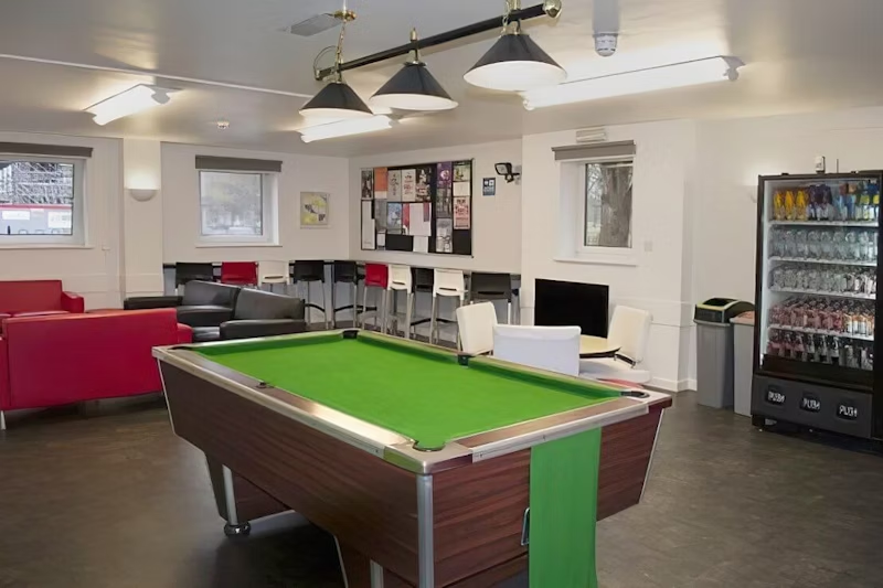 公寓公共设施丰富多元,满足学习与娱乐双重需求。专属自习室安静整洁,配备桌椅与照明设备,是专注备考、完成作业的理想场所;公共休息室温馨舒适,设有早餐吧,每日可享用简单早餐开启元气一天,闲暇时还能与室友、同学在此交流畅谈;娱乐区的免费台球桌是放松身心的好去处,课余时间约上好友切磋几局,缓解学习压力。此外,公寓设有独立洗衣房,配备洗衣机与滚筒式烘干机,解决日常洗衣烘干需求;专业维修团队随时待命,房屋出现问题可及时响应处理;同时提供自行车存放处与无障碍设施,兼顾不同同学的需求,24 小时贴心守护居住体验。