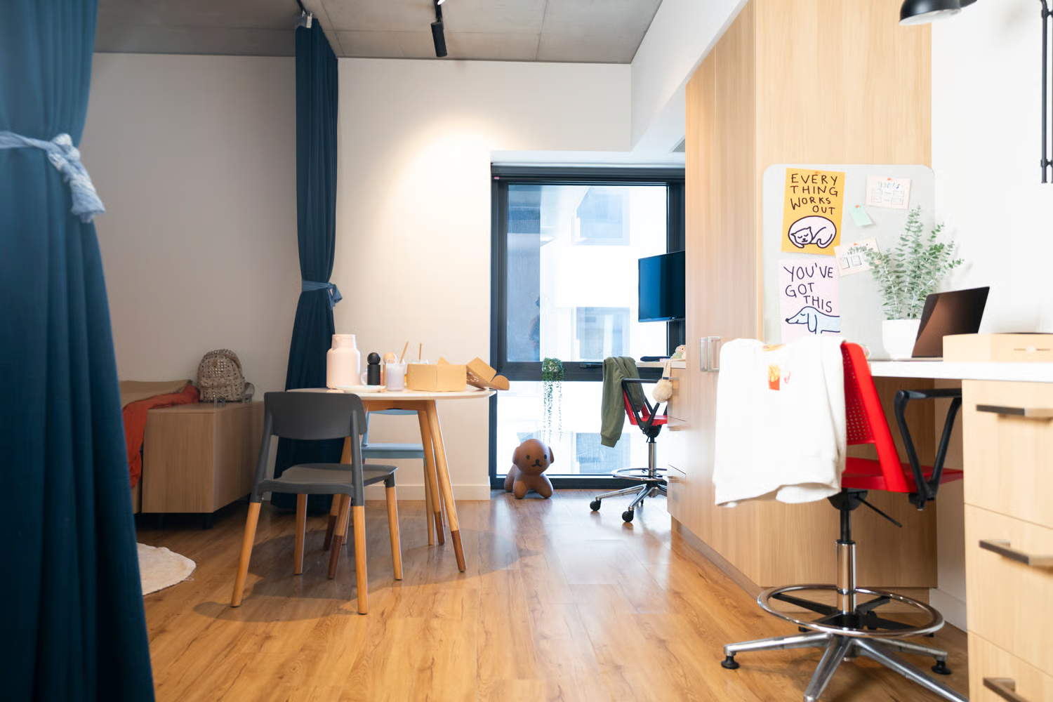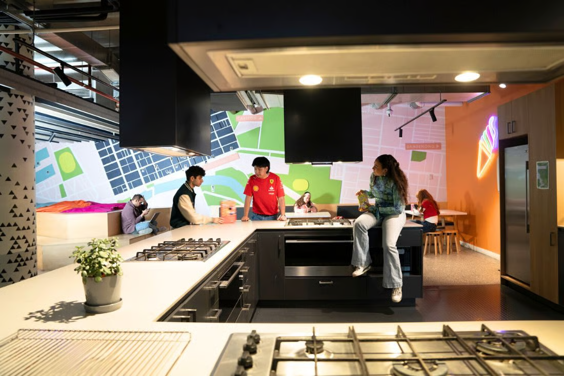 学习有专属图书馆和安静区域,小组讨论、独自备考都不慌;休闲有电影院、游戏室,累了还能去露台或庭院放松,24 小时健身房随时能练;生活上,公共厨房、洗衣房、自行车存放处都有,24 小时安保在,住得放心。