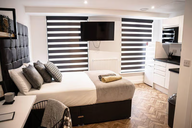 伯明翰豪华全 Studio 公寓!步行 7 分钟冲超市 + 商场,14 分钟到伯明翰大学法学院,允许双人入住(额外缴费),健身房 + 室外庭院配齐,包全 bills + 高速 WiFi,24 小时安保 + 智能手机钥匙,通勤休闲双便利。