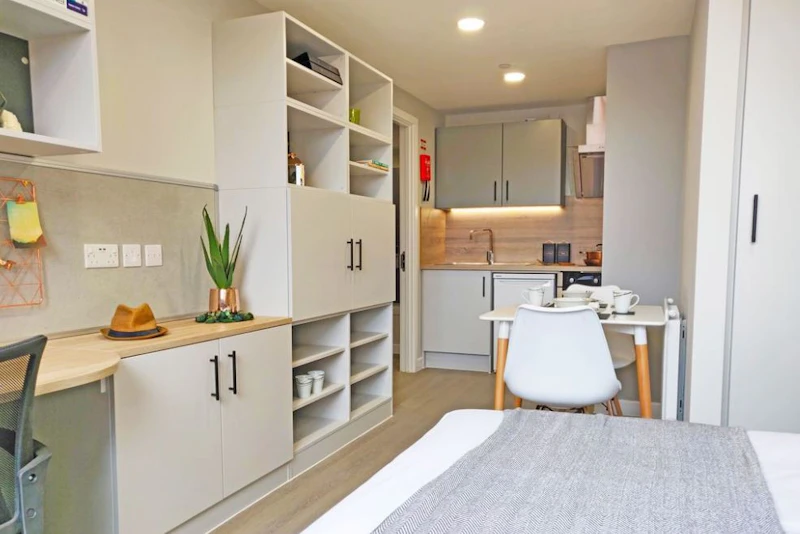 房间设计现代且实用,空间布局合理,为你打造一个真正可以放松身心的个人天地。主要提供En-suite(独立卫浴,共享厨房)和Studio(带独立厨房) 两种主流房型。每个房间都配备了舒适的双人床、宽敞的学习区以及可开启的大窗户,确保室内通风采光俱佳,天气好时阳光洒进来的感觉特别治愈。约克的夏天凉爽,因此房间未配备空调,但高效的暖气系统足以让你在漫长的冬季里始终温暖如春。公寓提供WiFi,水电暖费用包含在租金之中,配备安全门禁,安保人员,自习室,洗衣房,健身房,电影放映室。