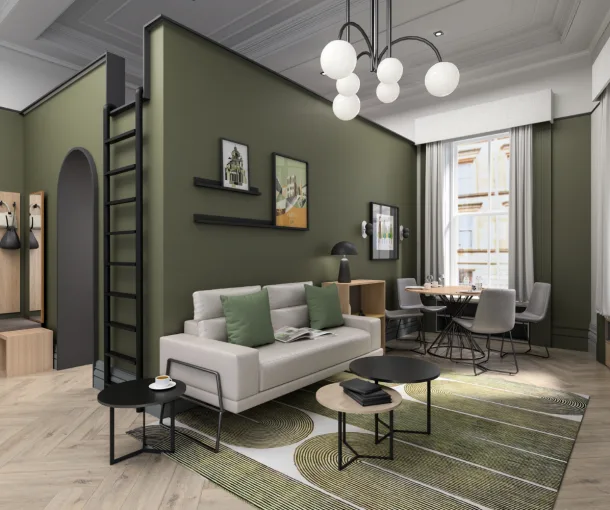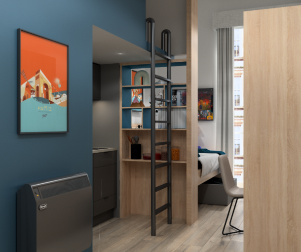 提供Smart至Grande多种Studio房型,均配备双人床、书桌、衣柜及独立厨房(含烤箱、灶具、冰箱)。每间含独立卫浴,窗户可开启通风,配备暖气系统,保障舒适居住体验。
