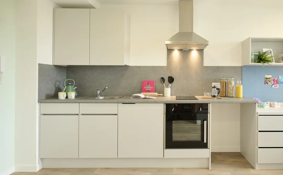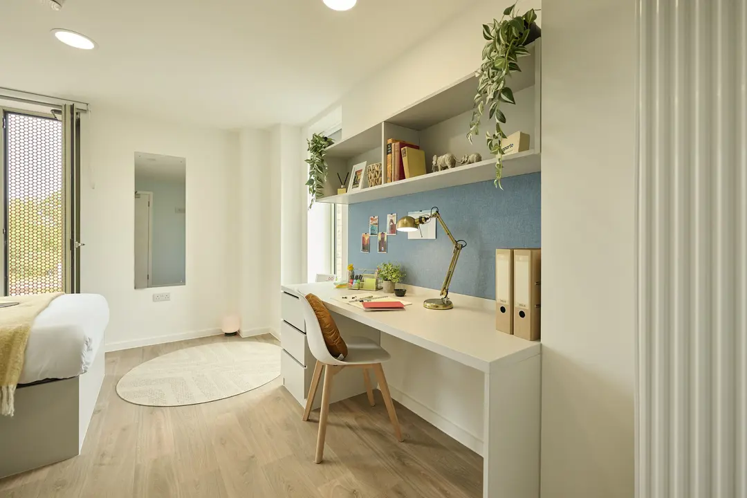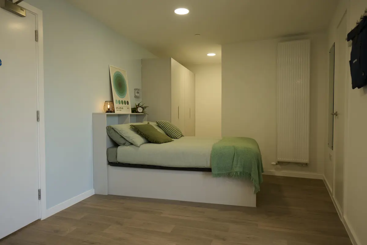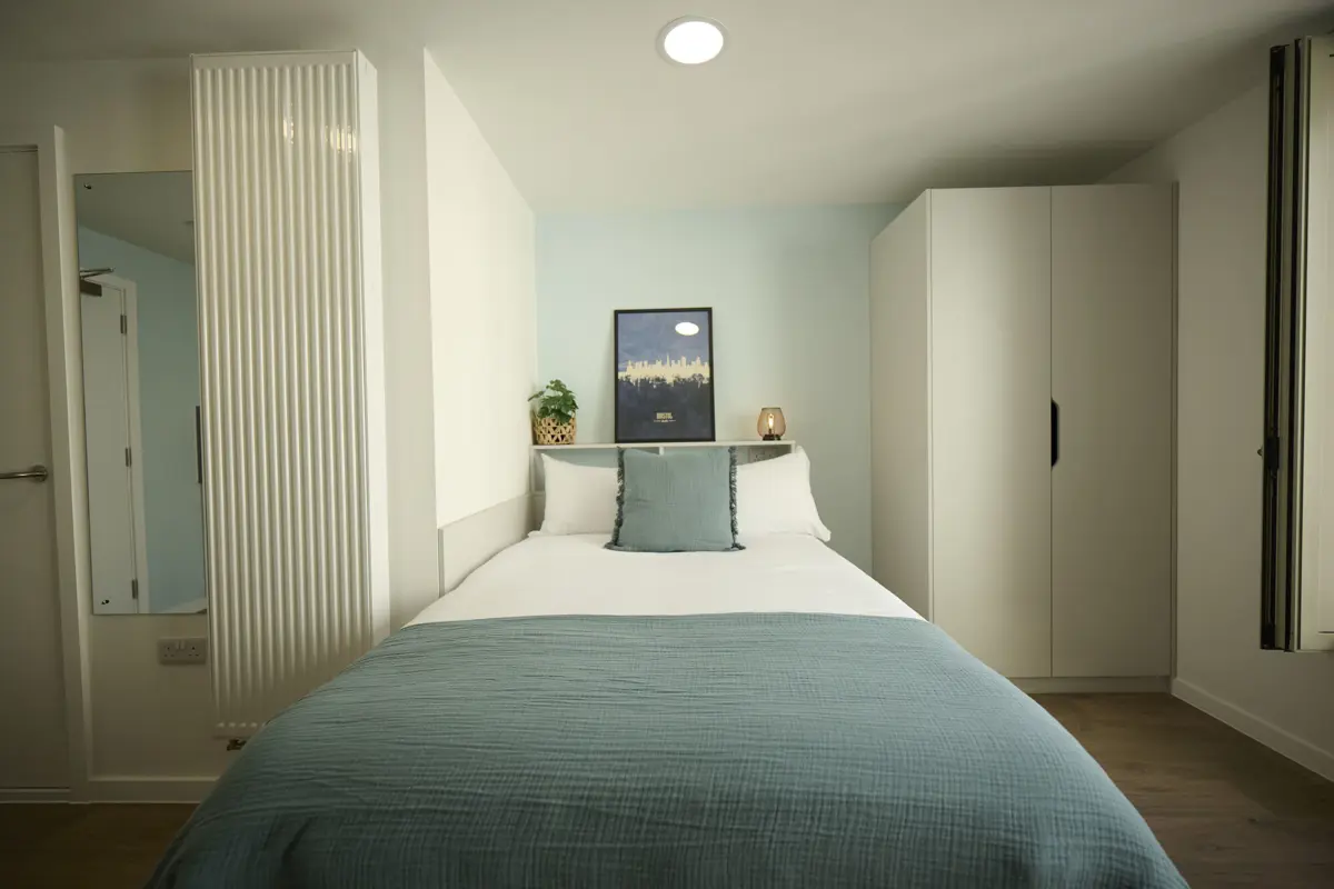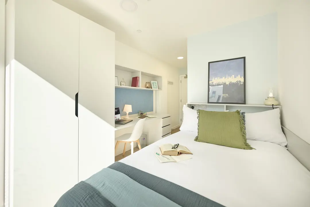 房型涵盖带独卫的套间(Ensuite)和独立单间(Studio),适配单人居住或合租需求。Ensuite房型为多人合租套间,共享厨房配备冰箱、烤箱等基础家电,还贴心提供吸尘器、拖把、熨斗等清洁工具;Studio房型自带独立厨卫,隐私性拉满,房间内配备超大储物空间,床下收纳+壁挂式储物柜双重加持,个人物品收纳无忧。所有房型均含高速WiFi,水电杂费全包含在房费中,居住成本清晰可控。