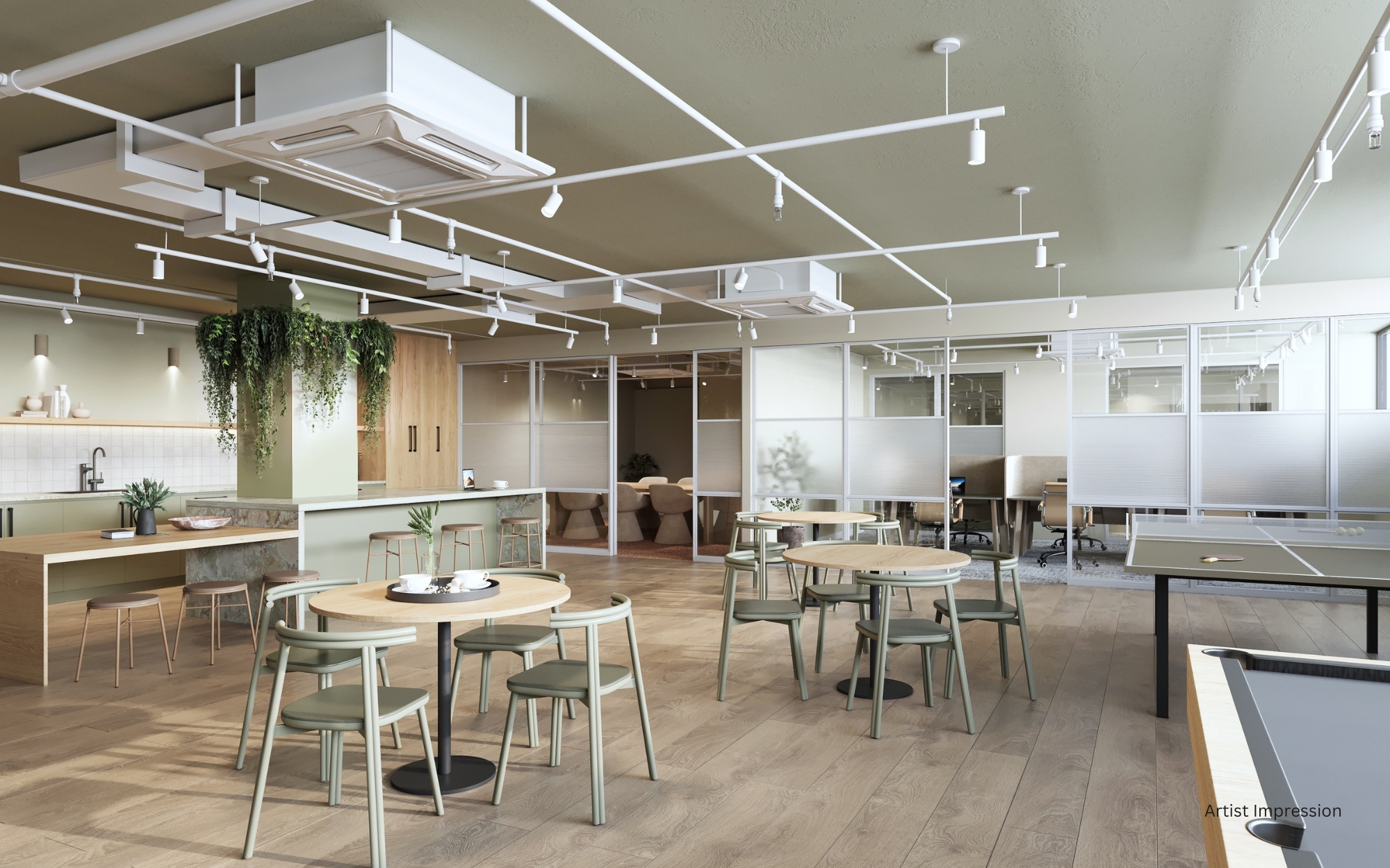 -共享工作空间:在家工作是一件轻而易举的事情,共享工作空间包括带隔板的桌子、可预订的私人视频会议室和带壁挂式电视的餐厅/会议室。