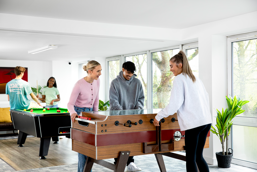 休闲社交空间:配备桌上足球、台球桌、影音室等公共活动室,是学生休闲互动的核心区域;另有户外社交空间,满足日常放松、小组交流需求;公寓亮点是配置超大的健身房,可以免费使用。