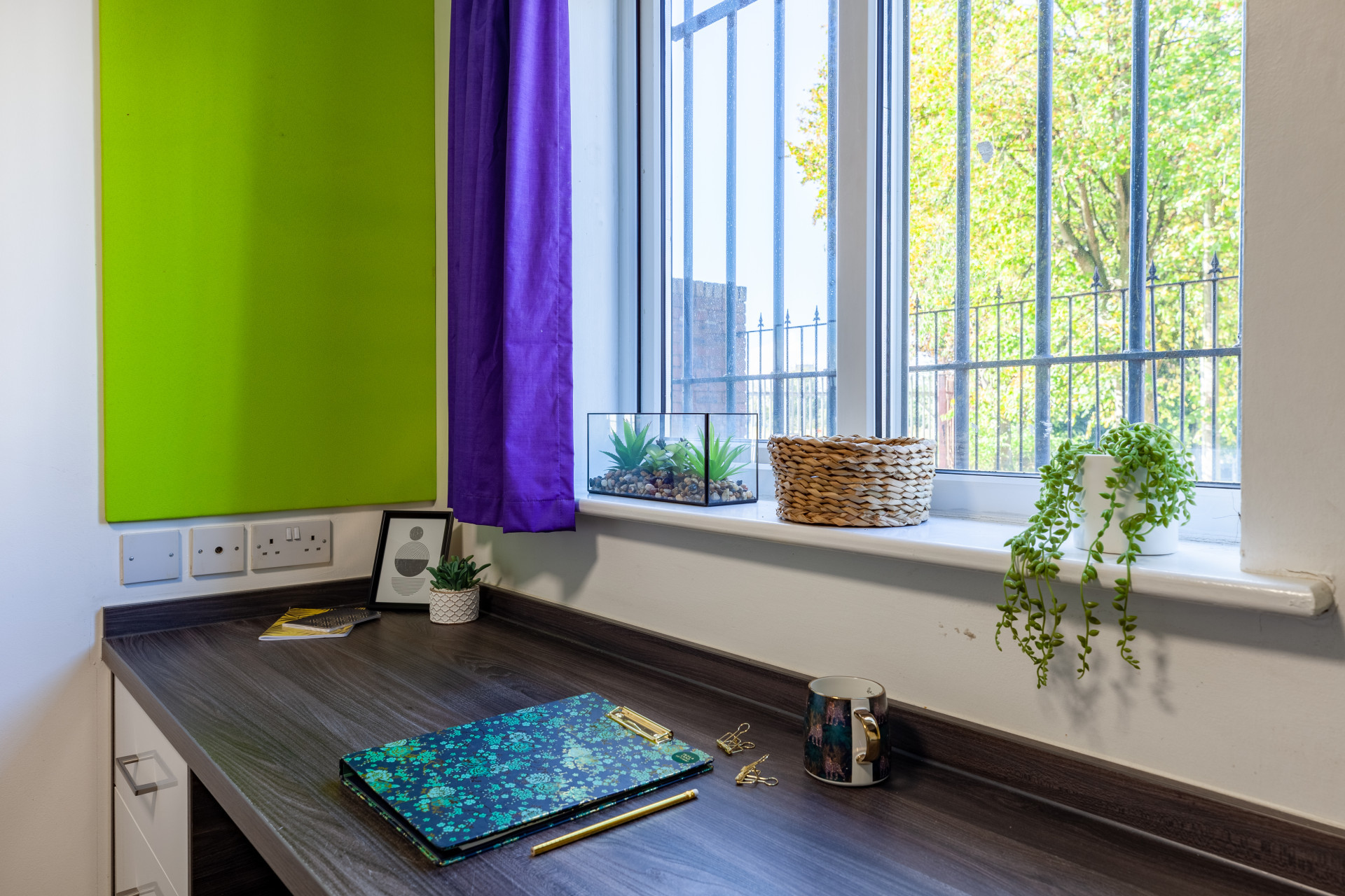 房间内部:提供En-suite房型,每间套房都配备独立卫浴,并设有共享厨房。您可以在配备吧台的共享起居空间放松身心,与室友轻松聊天,充足的书桌和储物空间,以及一张舒适的小双人床。
