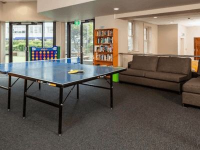 公共区域包括居民休息室、电视区、乒乓球桌、学习区、电脑设备与户外休闲空间。