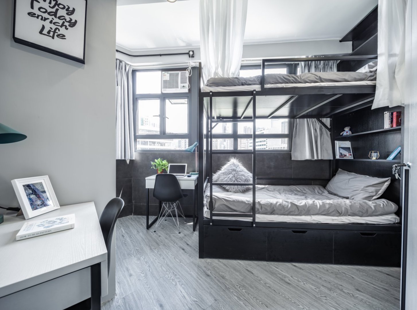 油麻地学生公寓是一座8层楼高的公寓,提供56间房间,包括双人房和单人房两种房型,满足不同学生的住宿需求。公寓内部设计精美,注重细节,是专为香港九龙区顶尖高校学生打造的高品质公寓,以流行的黑白灰ins风设计,注重品牌特色遮光效果,提供管理服务式住宿。凭借其高性价比、多储物空间、超大使用空间以及拎包入住的便捷性,赢得了全港学生公寓的高品质口碑,并且公寓还会定期举办一些活动,丰富留学生活。