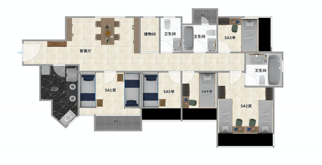 公寓亮点及特色:保留饭厅作为共享客厅,仅住4-5人,减少卫浴、厨房等设施的轮候时间,让合租生活更轻松和谐。