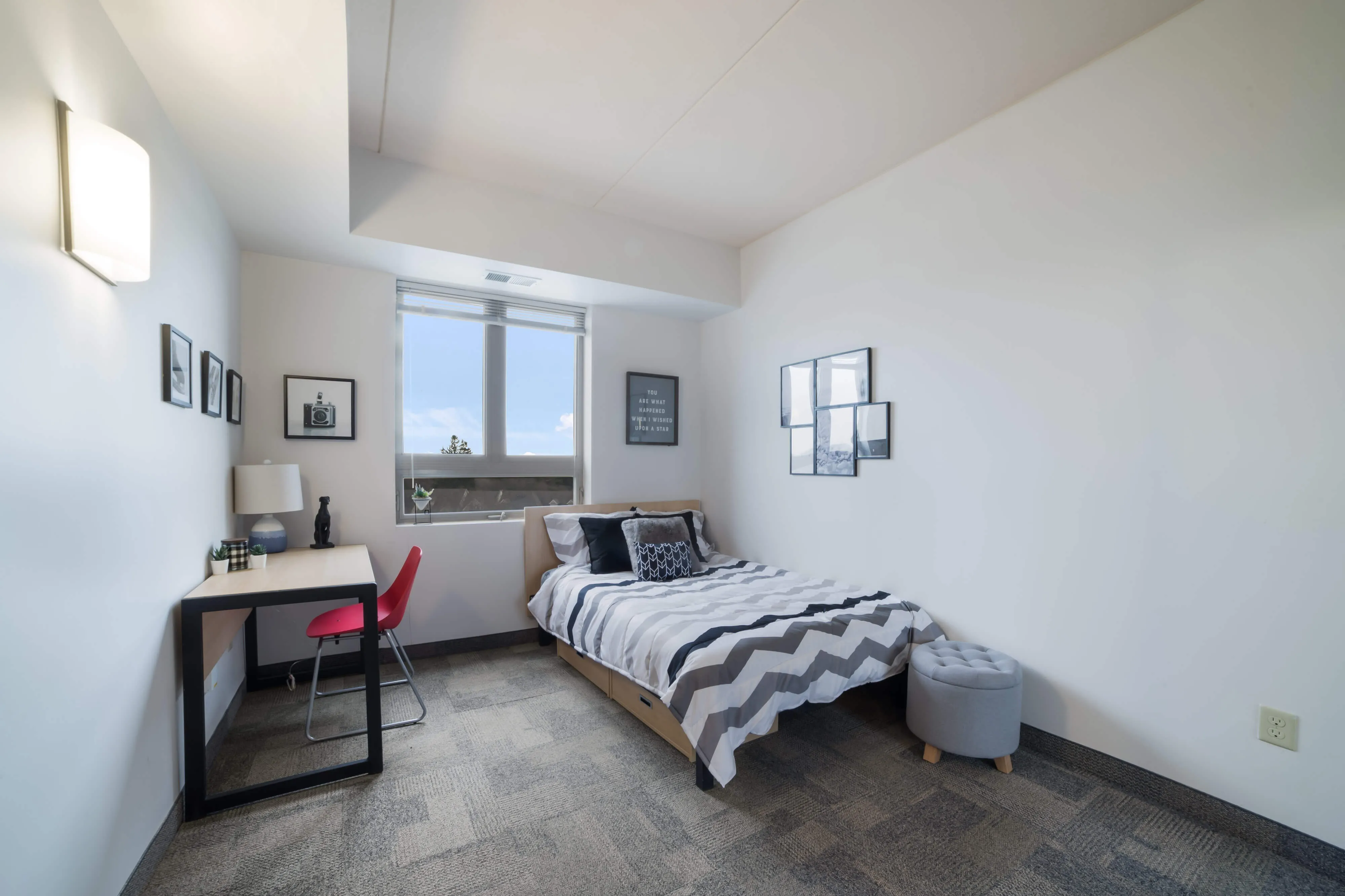 这间新装修的公寓为学生配备了多项便捷且舒适的设施。升级后的健身中心,满足日常锻炼需求;现代化的学习休息室,营造专注的工作环境;现场设有便利的洗衣设施。此外,还设有安全的自行车存放区,保障自行车安全且易于存取。