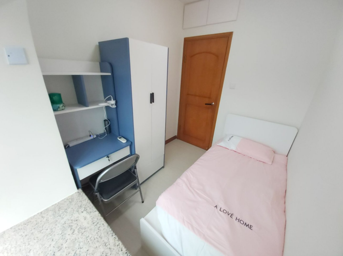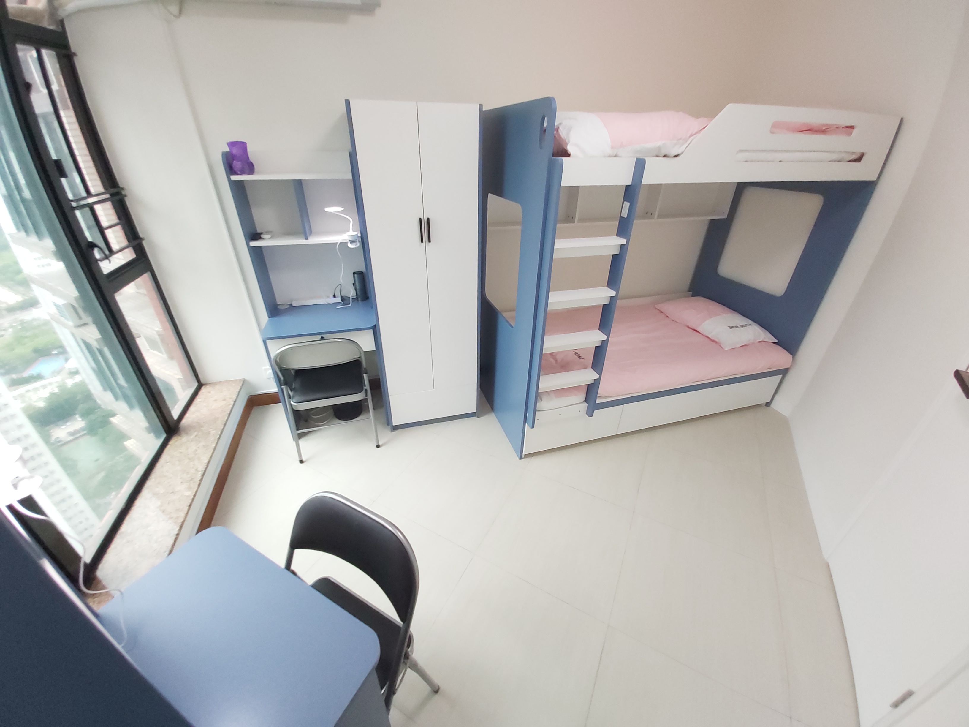卧室:床、 衣柜、书桌、椅子、天花灯、空调、台灯、 电线插板、床品。