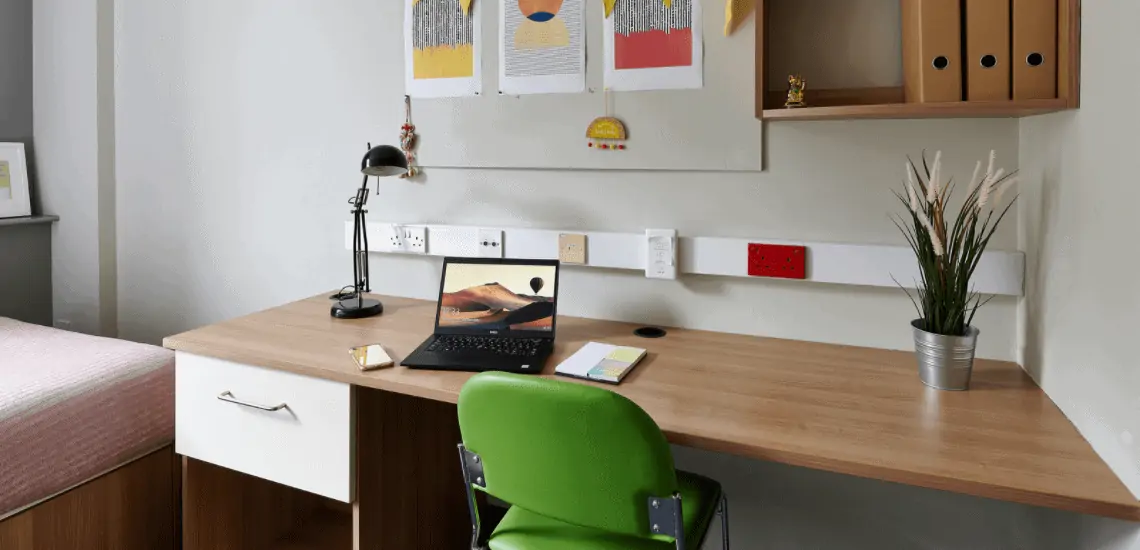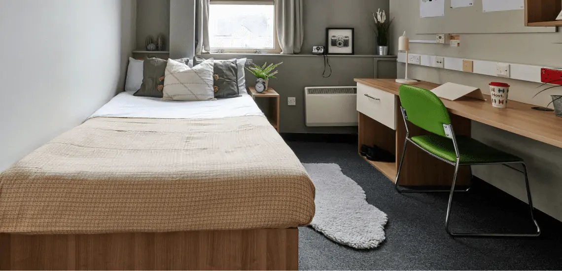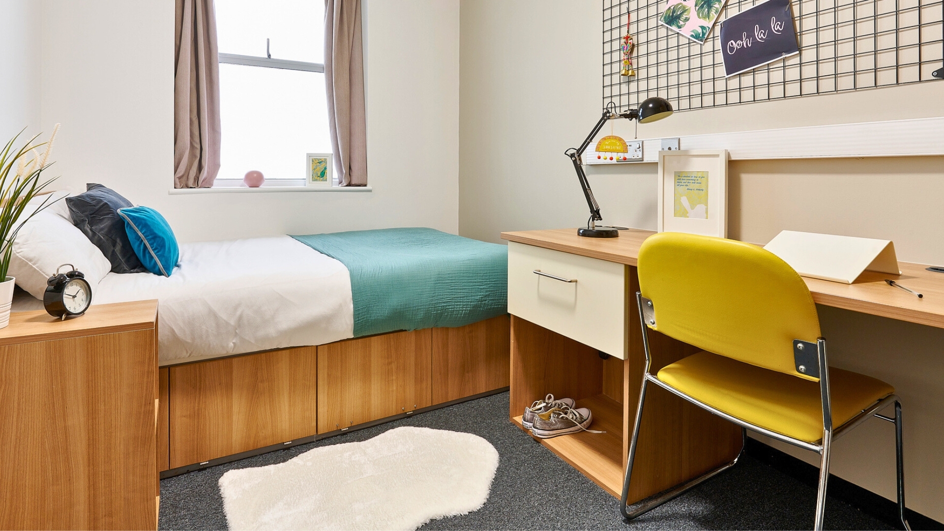 公寓提供Non-ensuite、Ensuite、Studio 和one bed房型。Non-ensuite 共用卫浴、共用厨房,ensuite 房型独立卫浴、共用厨房,该公寓多为2-7人间,是喜欢社交的学生的最佳选择;Studio和one bed房型独立卫浴、独立厨房,为学生提供更私密和自在的个人空间。 房间配有双人床、书桌椅、衣柜、穿衣镜等,有充足的储物空间。厨房配有灶台、冰箱、烤箱等。
