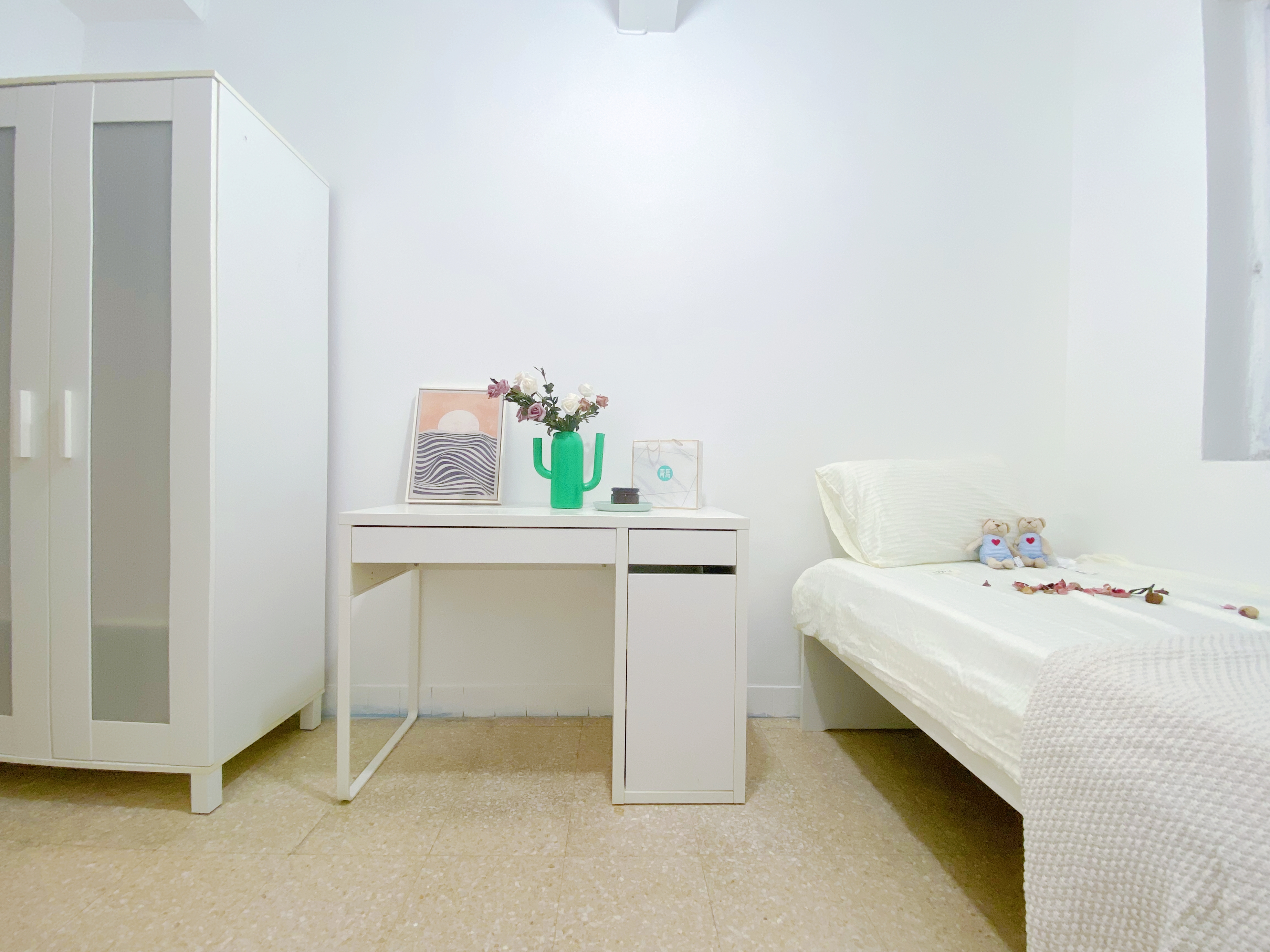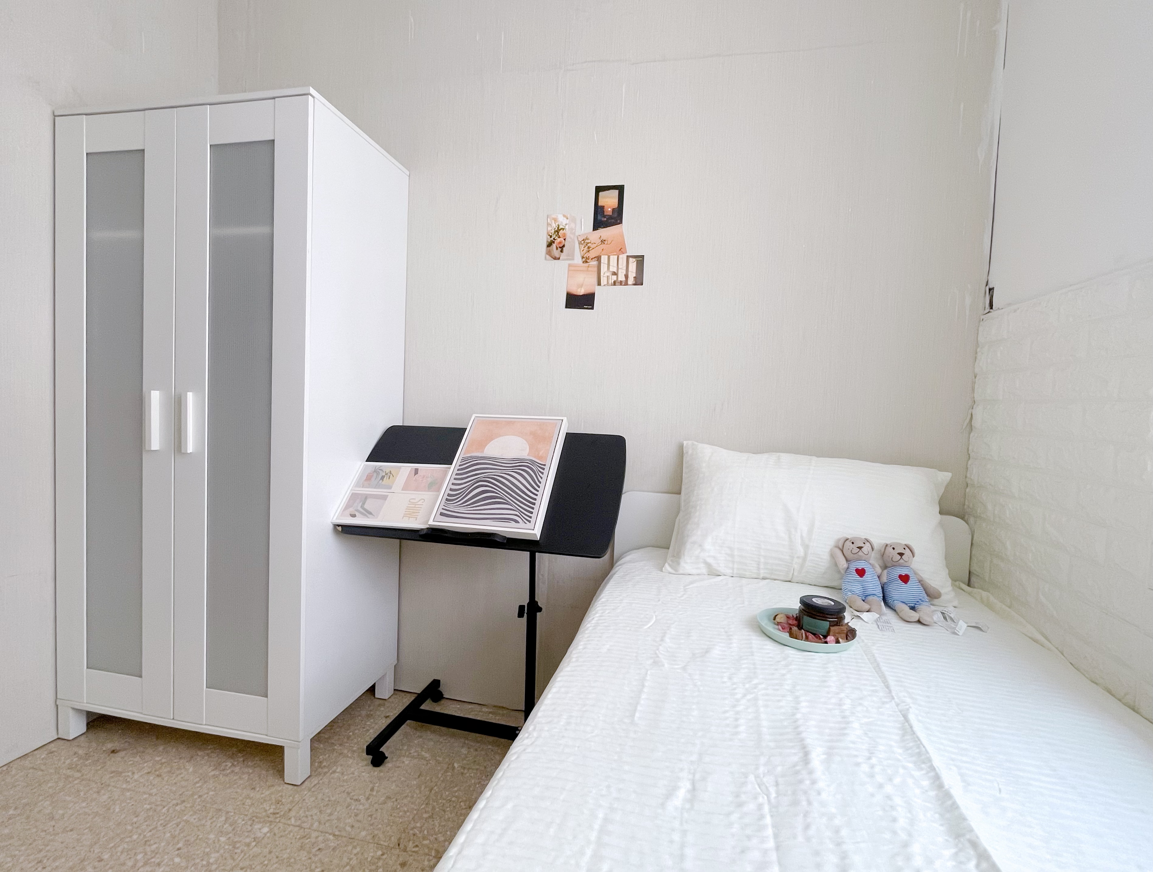 配置全套家具,拎包⼊住。包括⾐柜、床架、床垫、书桌、椅⼦、洗⾐机、冰箱、空调等