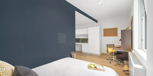 多房型适配多元需求!涵盖单间公寓、套房、共用房间,所有房型都宽敞通透,配全套家具 + 充足储物空间,现代化厨房带微波炉、冰箱,独立卫浴干湿分离,舒适床 + 人体工学桌椅 + 衣柜一应俱全,拎包入住无压力。公共设施超硬核:私人健身房随时撸铁,活动室、咖啡厅是社交放松好去处,放映室、表演舞台、游戏区承包休闲时光,不管是看电影、玩游戏还是小型演出都能满足;高速免费 WiFi 全覆盖,高效供暖系统四季恒温。顶楼专属福利:预订顶楼房型送免费床上用品、毛巾、厨具,还享每周清洁服务,居住体验直接拉满。安全与服务双保障:24/7 专业服务团队值守,24 小时安全门禁 + 安保 + 视频监控,高频深度清洁消毒;租金包含水电暖气、WiFi、财产保险,无隐藏开销;电梯、自行车库、洗衣房、无障碍设施齐全,维修团队响应及时。