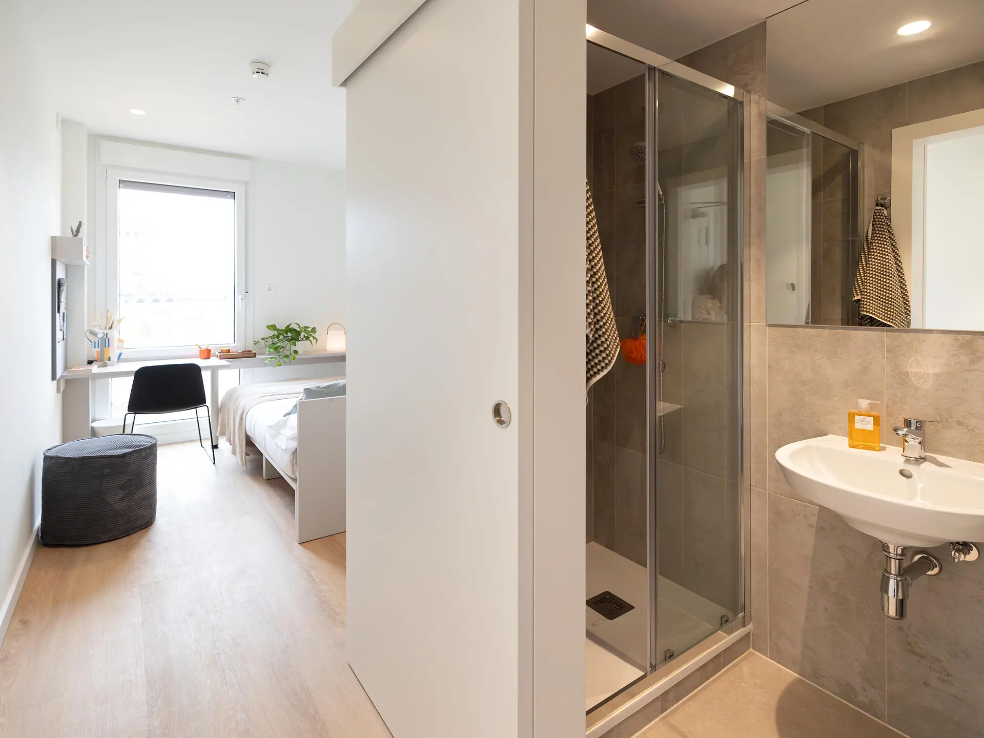 Alba Viu是位于巴塞罗那 Cerdanyola del Vallès 区的全新学生公寓。它坐落在充满活力的大学区,距离巴塞罗那自治大学(UAB)Bellaterra 校区仅一步之遥,步行仅需5分钟,是学生党的不二之选。公寓周边交通便利,门口就是公交站,还有免费校车直达大学;Cerdanyola Universitat 火车站步行 10 分钟30 分钟直达巴塞罗那市中心,无论是上课还是探索城市都轻松搞定。周边超市、餐厅、医院一应俱全,生活购物超方便。Alba Viu 提供多种房型,包括私人工作室和单人间,房间内配备双人床、书桌、椅子、微波炉、冰箱等,满足你的日常需求。公寓内的公共设施堪称豪华:室内有电影院、咖啡吧、公共休息室、餐厅、健身工作室、游戏室、播客工作室和学习空间;室外有庭院和两个游泳池,让你在学习之余也能尽情放松。此外,公寓还提供全包餐饮服务、24 小时监控、免费自行车存放和定期清洁服务,让你住得安心又舒心。