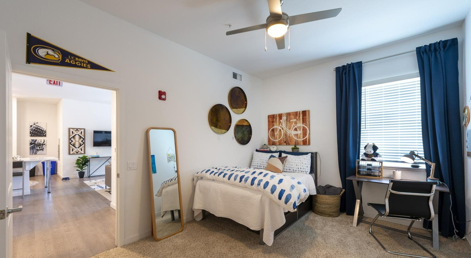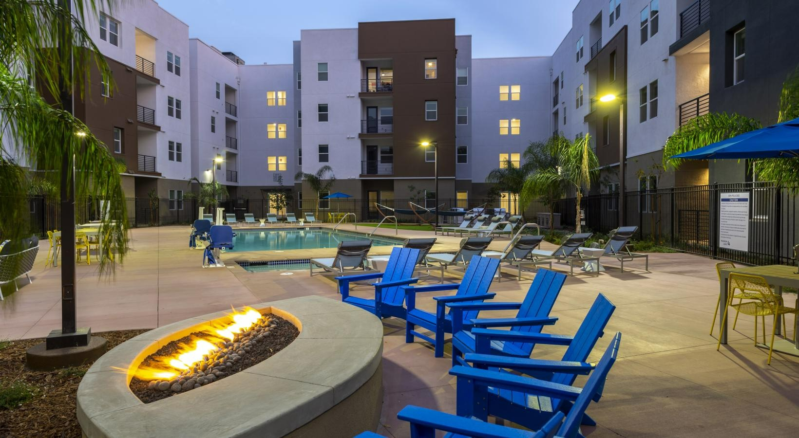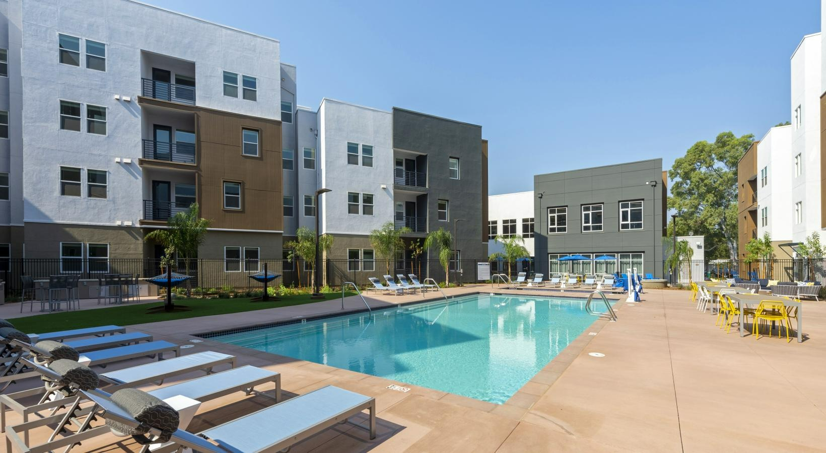 该公寓毗邻加州大学戴维斯分校,步行30分钟可达校园且位于校车路线上,提供Studio和合租户型。社区配备游泳池、户外瑜伽区、游戏区、BBQ及带电视的客厅,设自习室、自行车库、停车位与充电桩,并有专业维修团队保障。周边生活便利,步行15分钟可达饺子馆,25分钟内分布三家超市(含亚洲超市),30分钟步行圈覆盖多家中式餐厅。