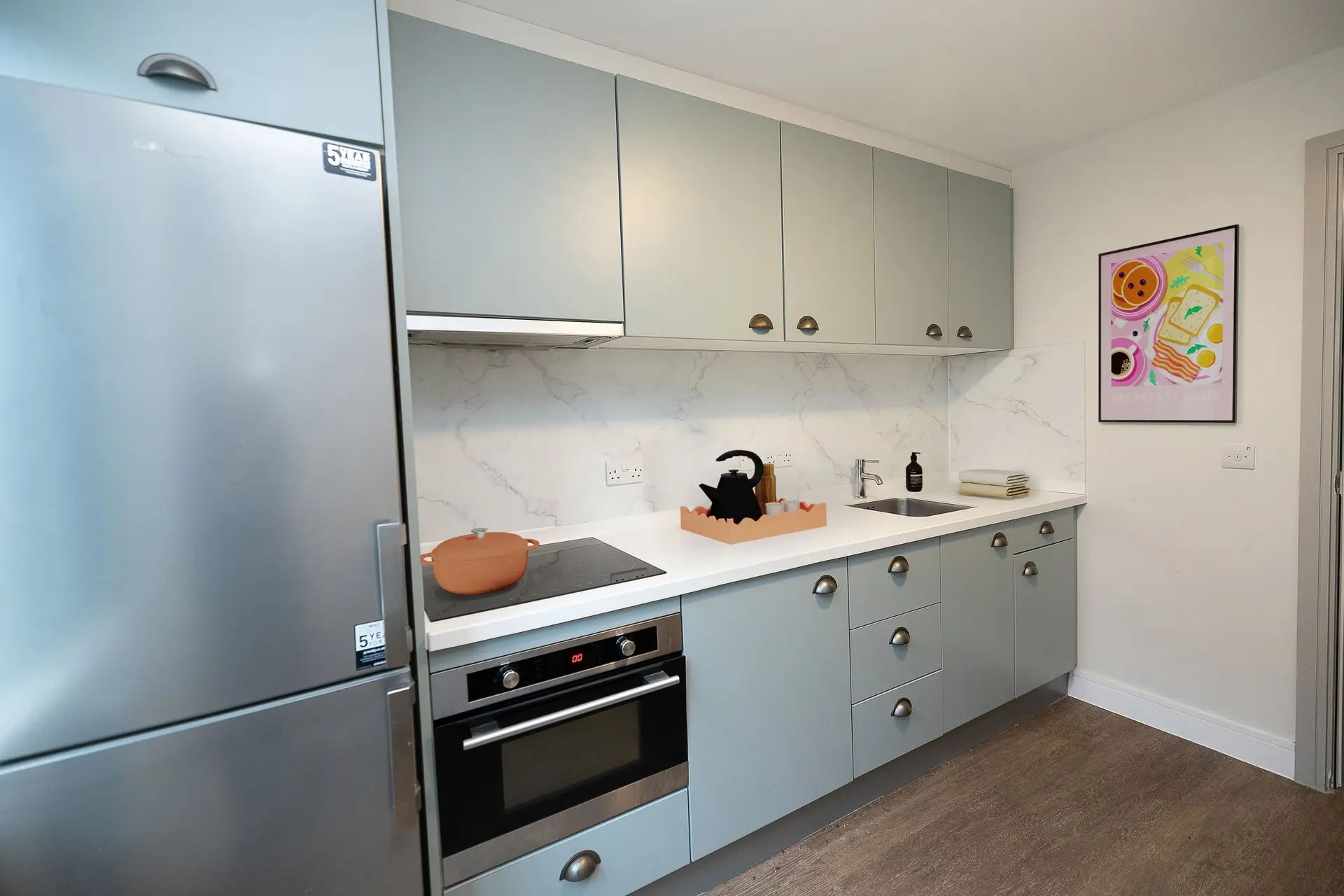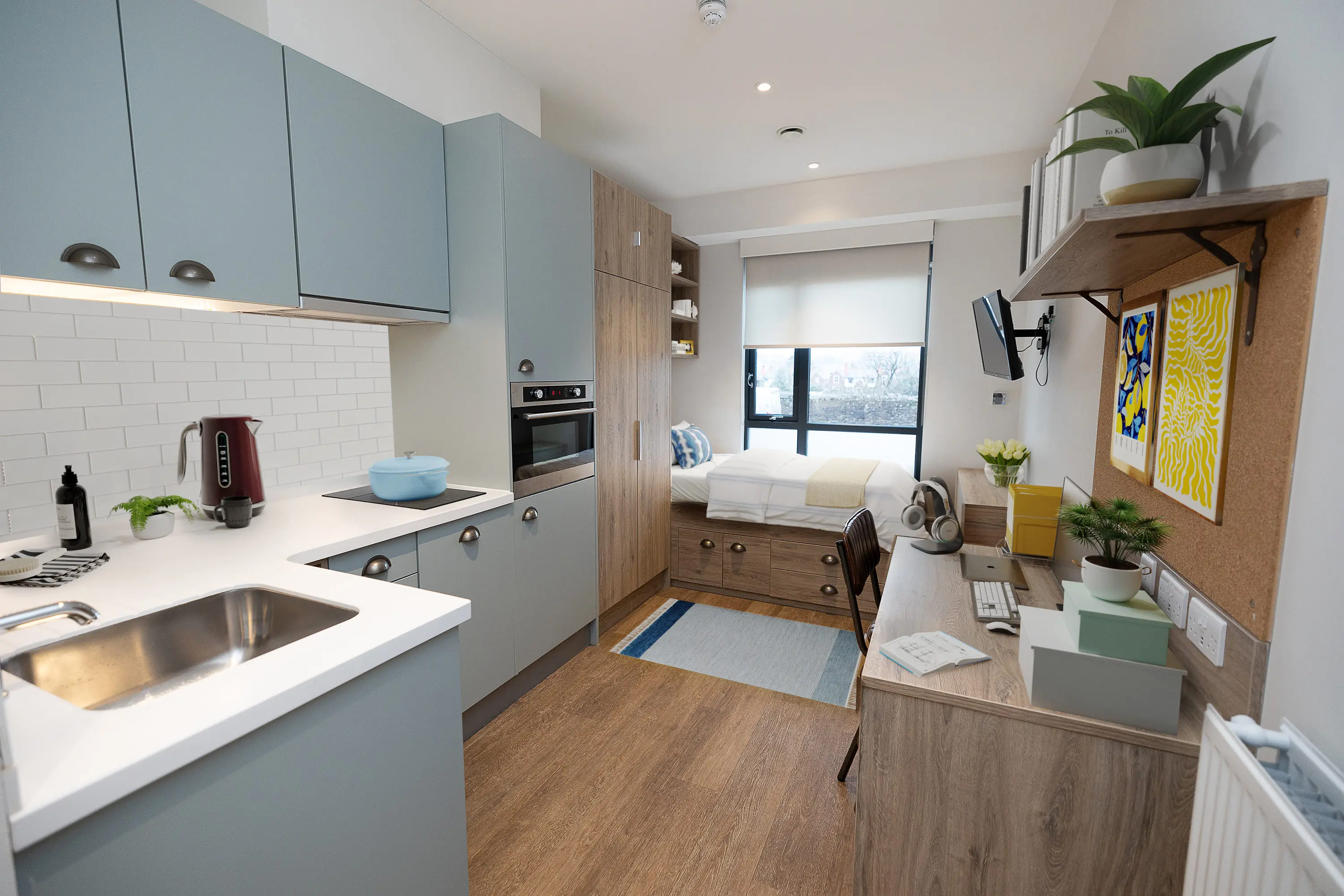 公寓提供Studio 和2-bed ensuite房型。2-bed ensuite 房型独立卫浴、2人共用厨房,是喜欢社交的学生的最佳选择;Studio房型独立卫浴、独立厨房,为学生提供更私密和自在的个人空间。 房间配有双人床、书桌椅、衣柜、穿衣镜等,有充足的储物空间。厨房配有灶台、冰箱、烤箱等。