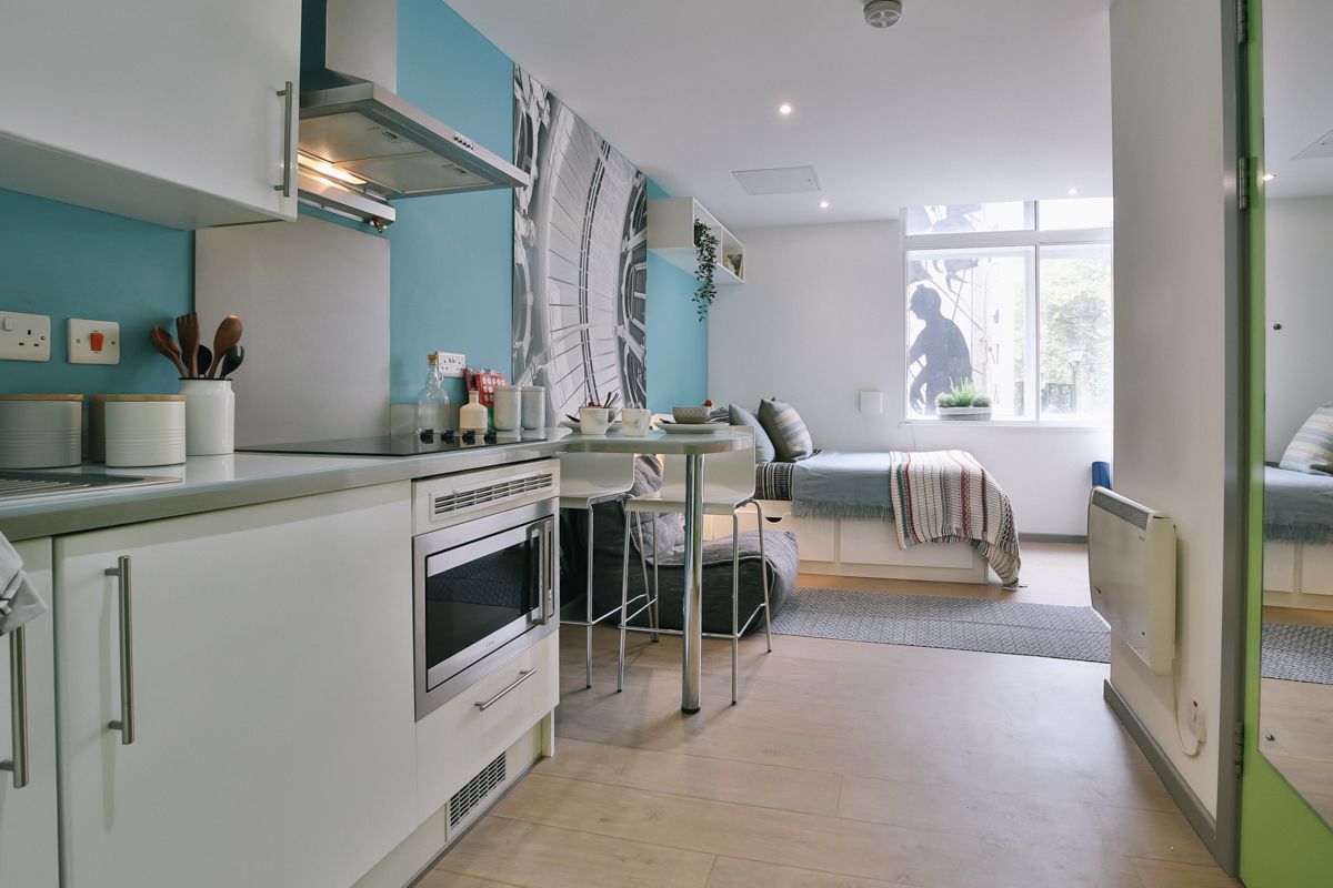 公寓提供双人间(2b1b)和studio户型,所有房间窗户都可打开,公寓坐落于一个缓坡底部,坡度落差相对小,上学不费劲,楼下就是Tesco Express便利店,隔壁市政厅,天气好的时候可以去市政厅大草坪躺平放松。