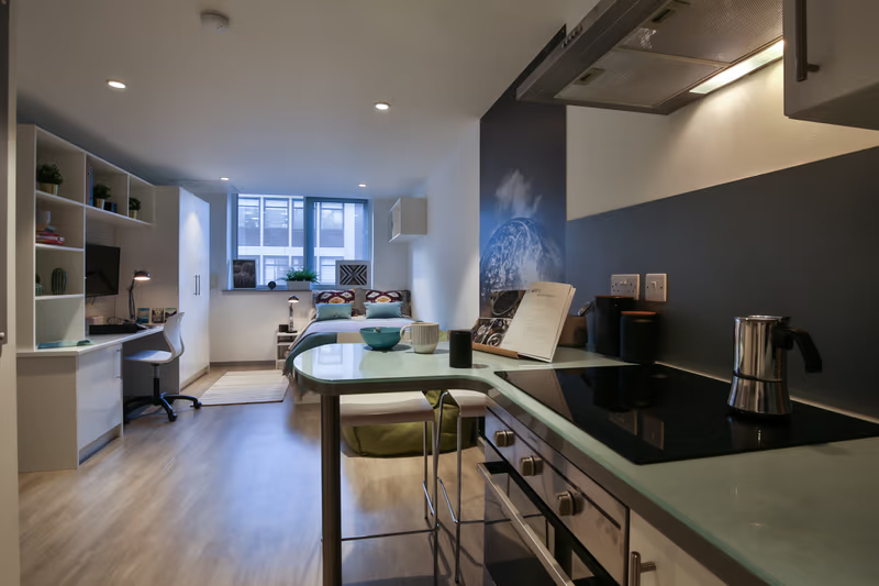 房型包括 self‑contained studio 和 shared apartments with ensuite / shared kitchen & bathroom。每套房间均配家具(床、衣柜/储物、书桌/椅)、厨房(冰箱、炉灶、微波炉/烤箱、抽油烟机等)、卫浴(shower / private bath / ensuite)。室内设计现代,采光通风良好,studio 房型适合独居,ensuite 房型适合合租。所有房间均提供高速网络,租金包括水、电、暖气及网络费用,无需额外支付。