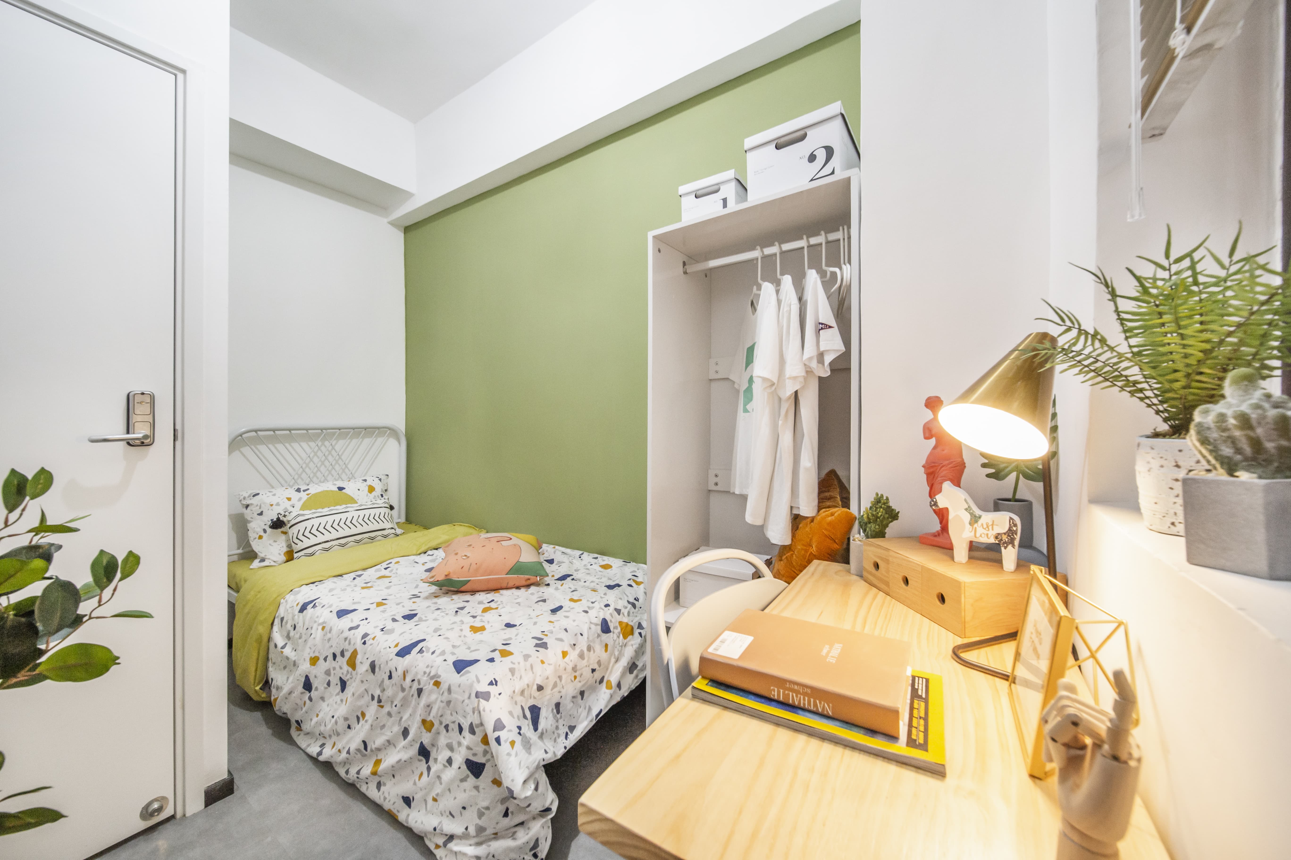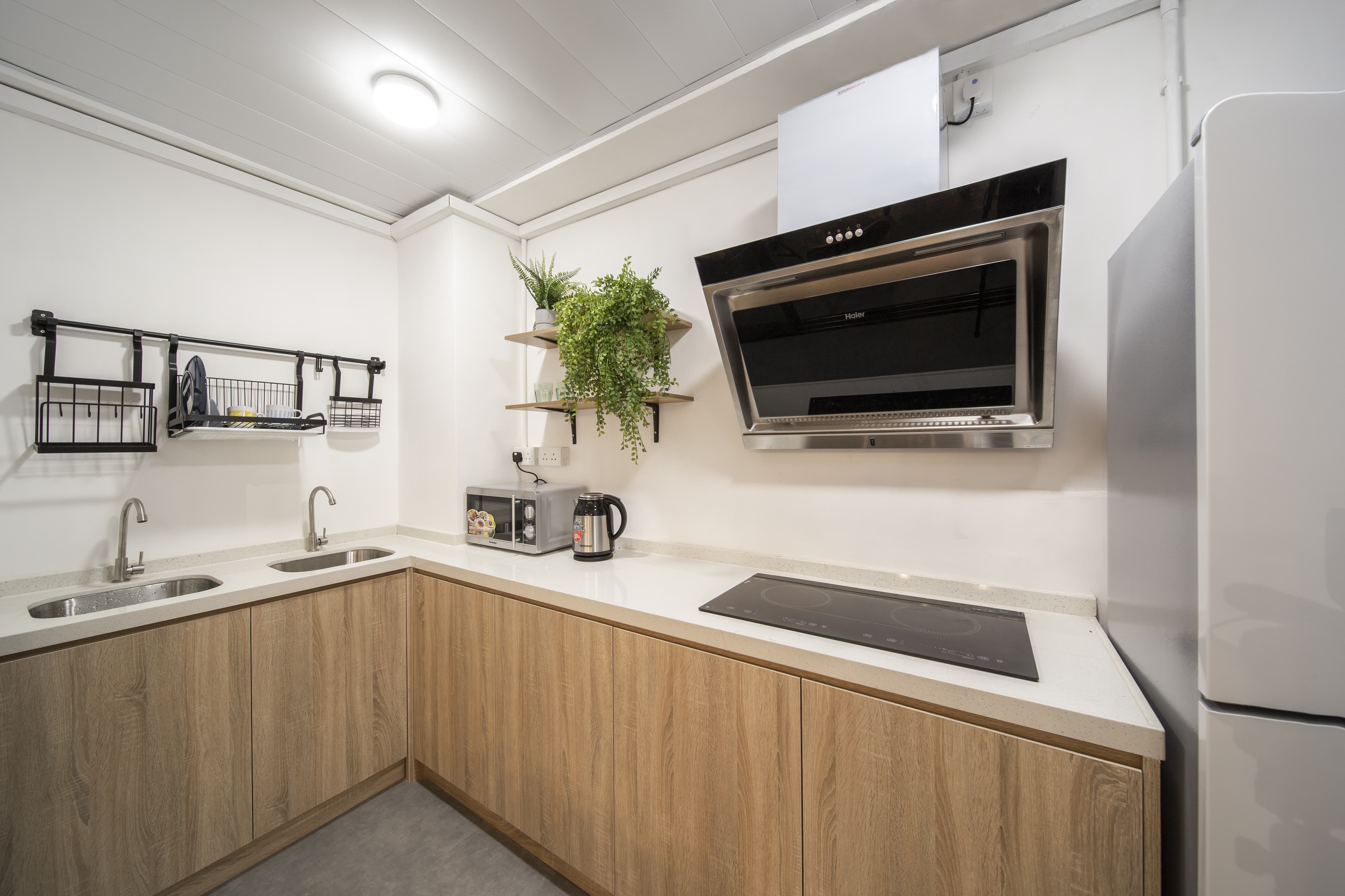 公共设施:洗衣机、烘干机、电磁炉、微波炉、电热水壶、置物架、热水炉、休闲天台、拍卡门禁、智能监控