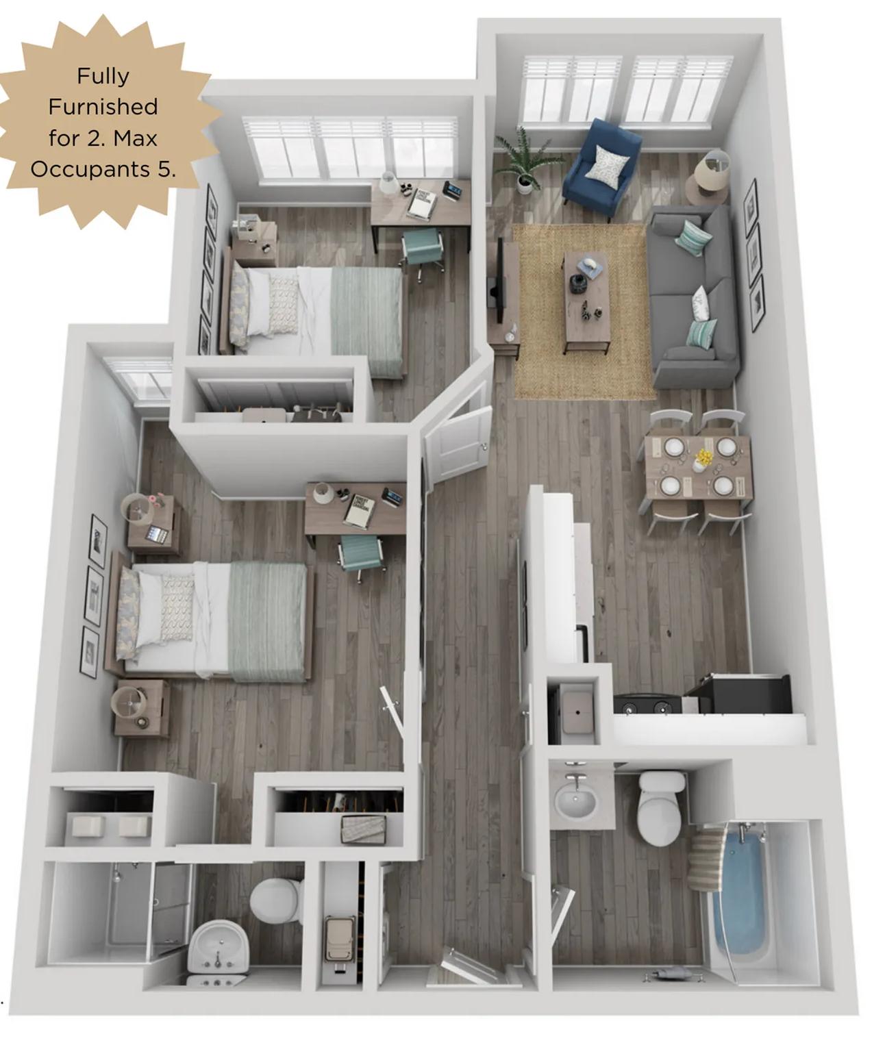 精装:全套家具、升级款含步入式衣帽间、木纹地板、私人阳台