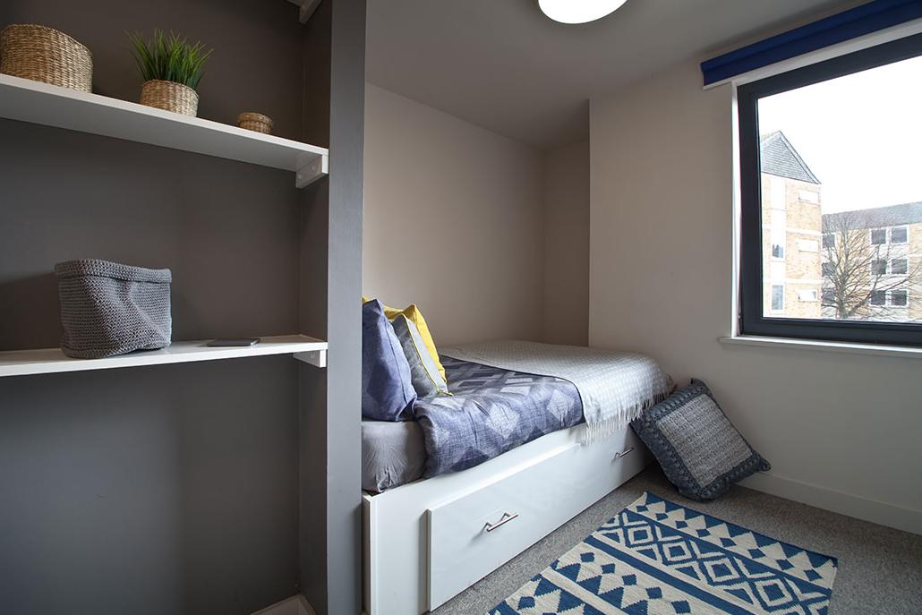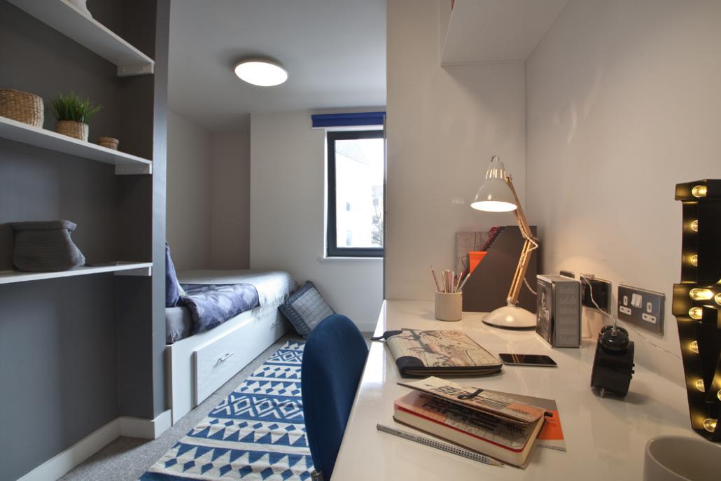 提供Studio与En-suite两种房型,配备舒适双人床、定制书桌及现代化家具。独立厨房满足烹饪需求,全景窗引入街区景观,充足储物优化空间利用。