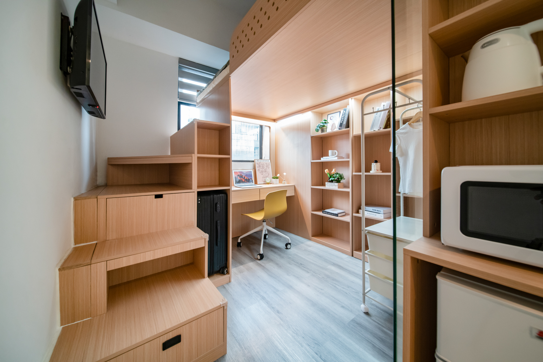 配置:床、床垫、书桌椅、衣柜、中央空调、窗帘、冰箱、热水壶、微波炉、干湿分离卫浴、24小时热水供应、无线wifi