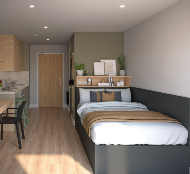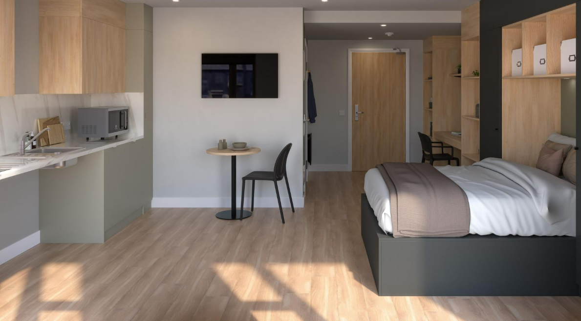 房型为Ensuite(共享客厅厨房)与Studio,面积宽敞。均配独立卫浴与可开窗户,Studio带独立厨房,书桌储物充足,暖气稳定抗湿冷。