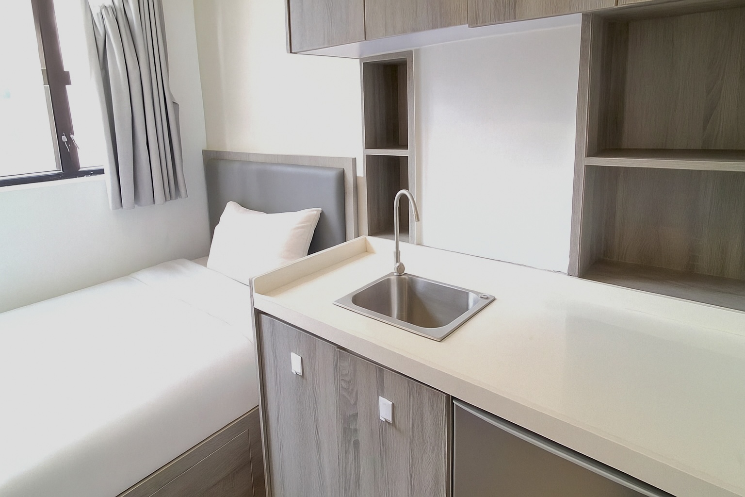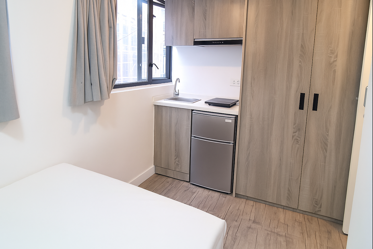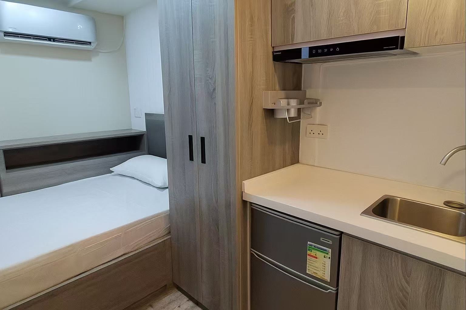 房间内配备独立卫浴、内置衣柜、小厨房、冰箱等家具家电,满足基础生活所需
