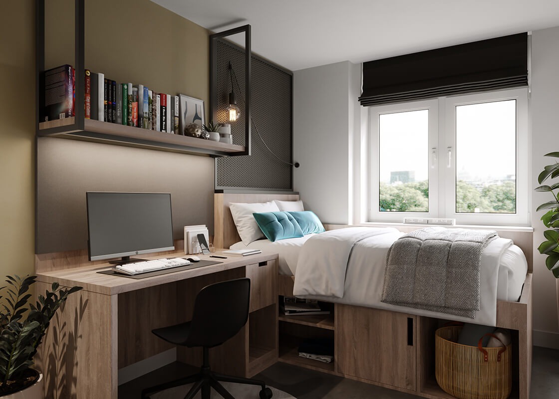 -主要提供En-suite(独立卫浴,共享厨房)和Studio(独立厨房和卫浴)两种房型,En-suite面积13-19平,Studio面积22平左右。房间内通常配备床、书桌、座椅、衣柜和储物空间,租金包含所有水电费、高速 WiFi、24 小时客服与安保、每周 2 次免费早餐、每日免费热饮、财产保险,以及丰富的社区活动,居住体验上兼顾学习与生活平衡,既有满足专注学习的空间,也有促进社交的公共区域。