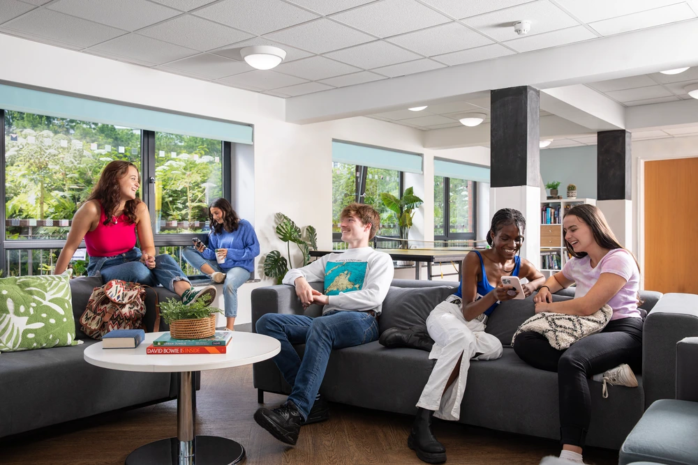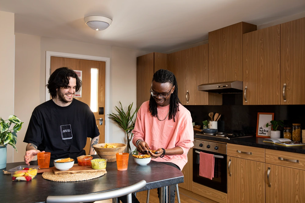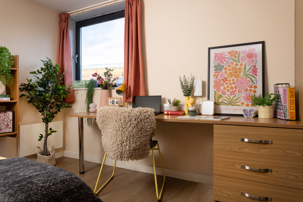 房间内部:每间卧室均配备英国标准小双人床、书桌椅和衣柜,储物空间充足。窗户可开启,通风良好。Ensuite房型为4-6人间,共享厨房与客厅。公寓还配有少量的2 bed 房间,非常适合结伴入读的同学选择;Studio房型则设有独立厨房与卫浴,适合喜欢做饭和喜欢享有私密空间的学生。