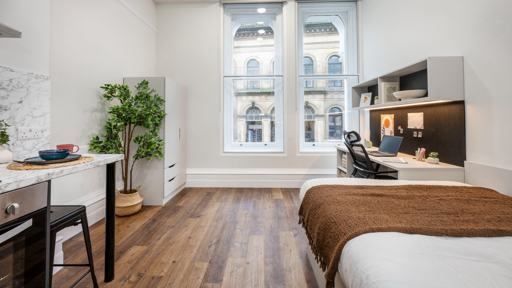 房间内部:主打设施完善的独立 Studio,每间 Studio 均经过精心设计,配备采光良好的学习区与充足储物空间,既满足学生日常居住需求,也为学术学习提供舒适环境。此外,公寓还设有公共休闲与学习空间,兼顾社交与独处需求,助力学生在利兹享受兼具学术氛围与城市活力的留学生活。