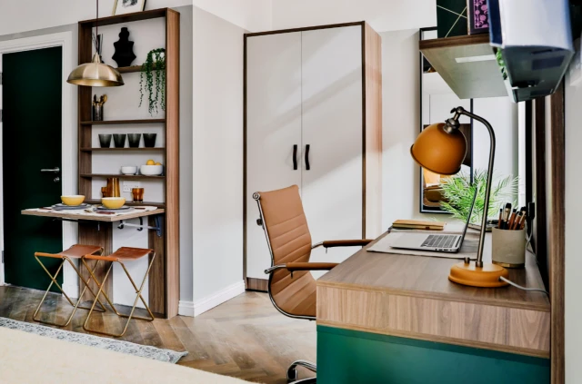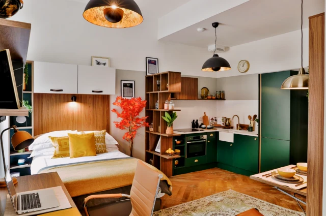 公寓提供非套间与Studio两种房型。所有房间均配有双人床、书桌、衣柜等全套家具,Studio房型内含独立厨房,配备冰箱、电磁炉、微波炉等设备,满足日常烹饪需求。