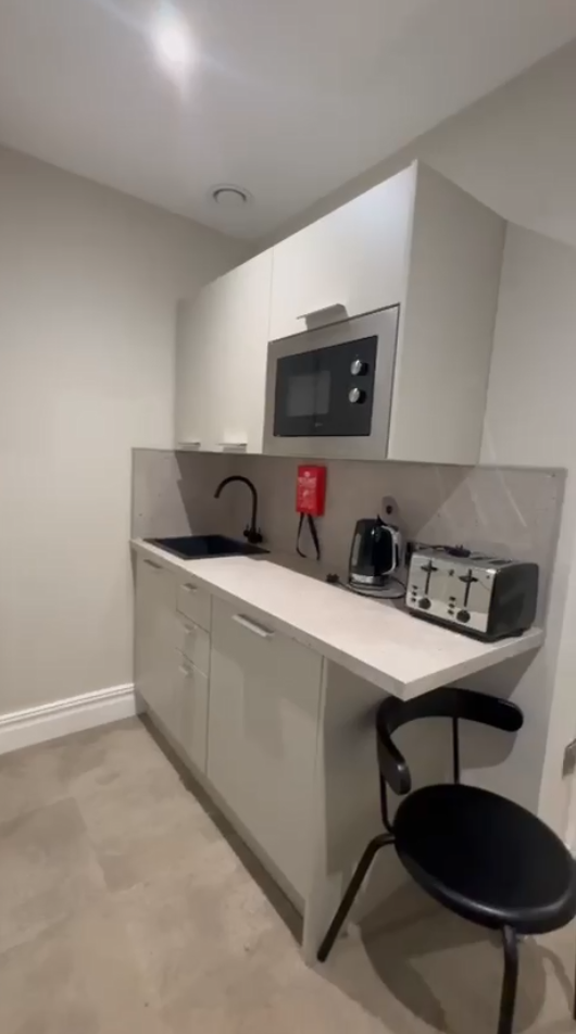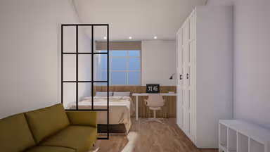 公寓提供Studio 房型,独立卫浴、独立厨房,为学生提供更私密和自在的个人空间。 房间配有双人床、书桌椅、衣柜、穿衣镜等,有充足的储物空间。厨房配有灶台、冰箱、烤箱等。