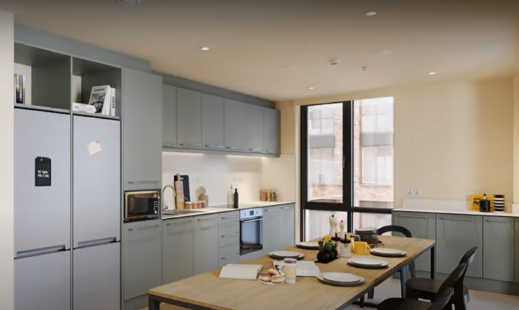 所有房间配备床、书桌、衣柜及充足储物空间,部分房型带独立卫浴,兼顾隐私与舒适。公寓设有共享厨房、公共用餐区、休息和社交区,厨房设备齐全,包括冰箱、炉灶、烤箱及基本厨具,适合学生自炊或与舍友共享生活。公寓提供高速网络、公共洗衣房、自行车存放、垃圾回收、电梯及学习室,学习、生活和社交空间兼顾。