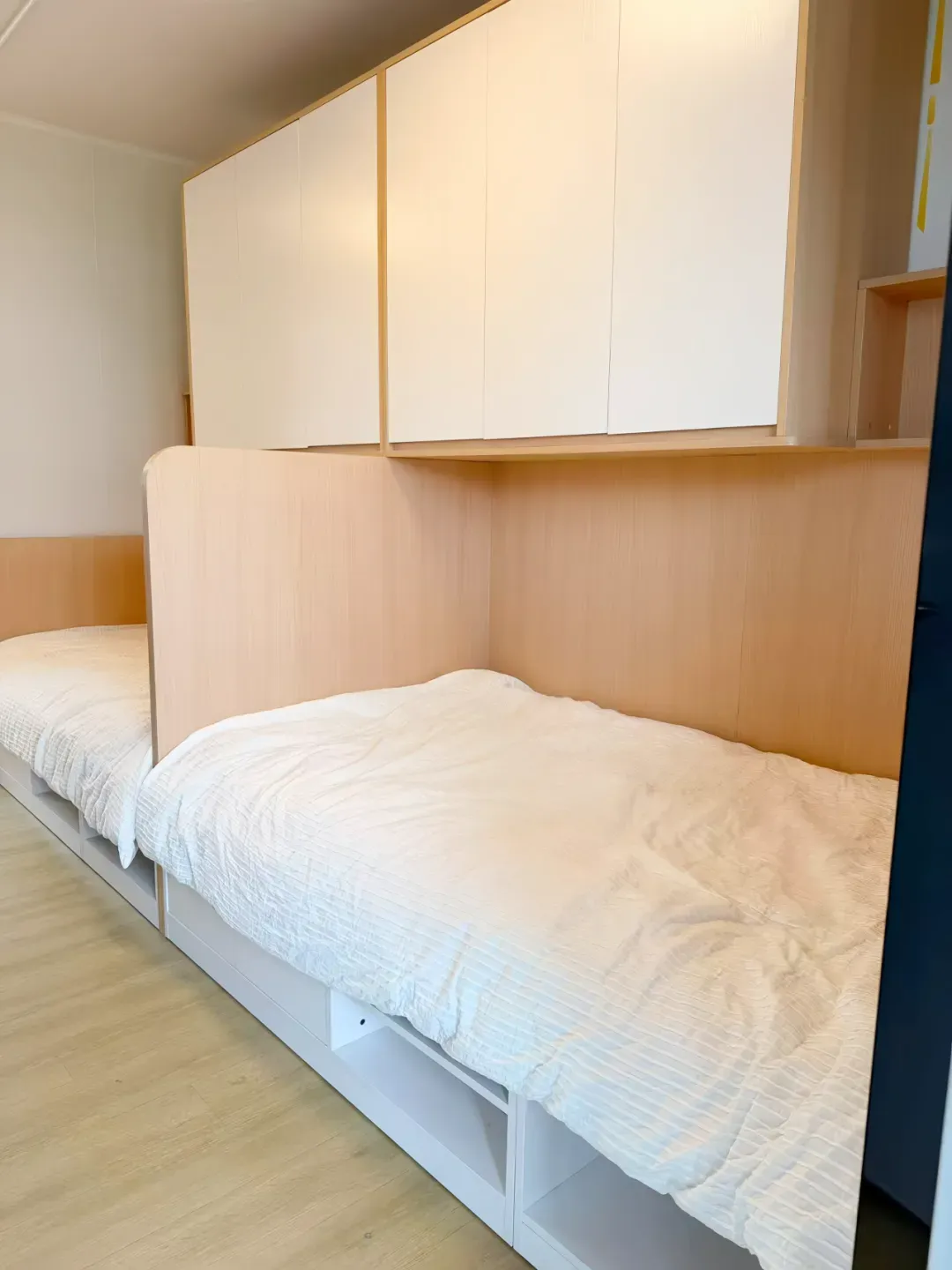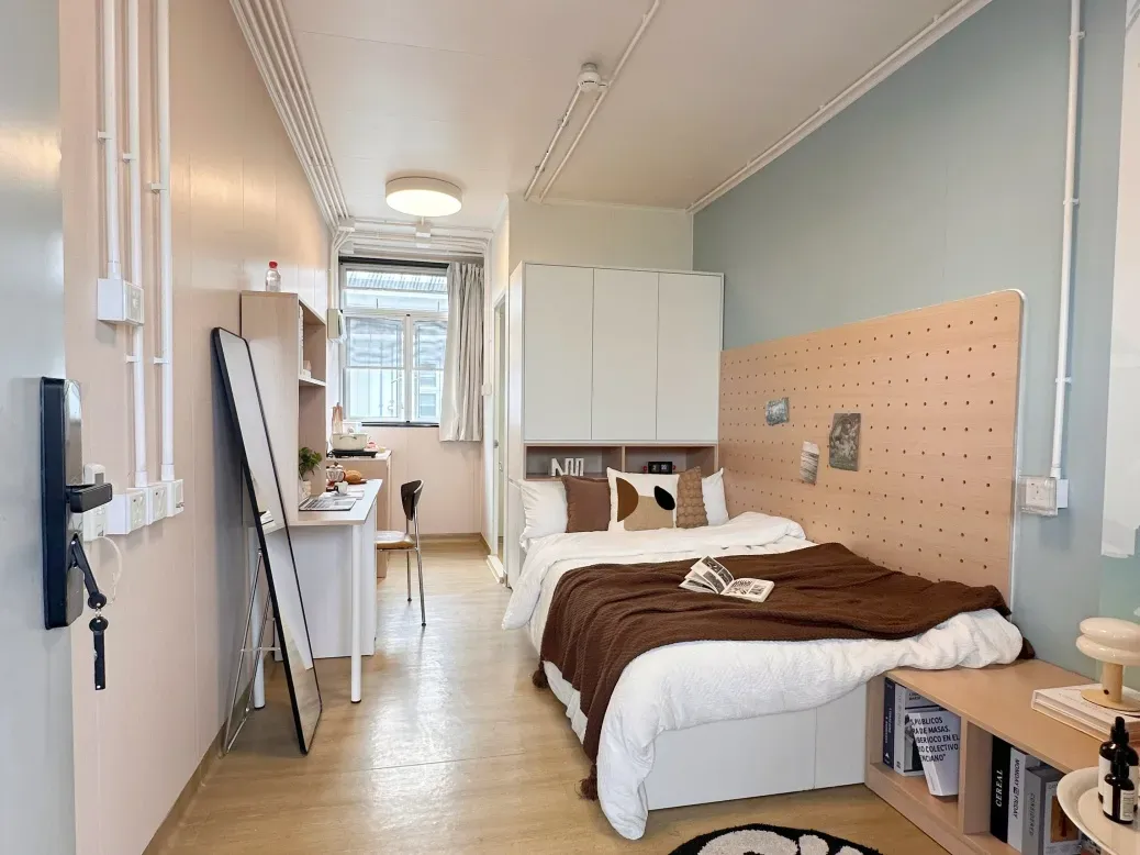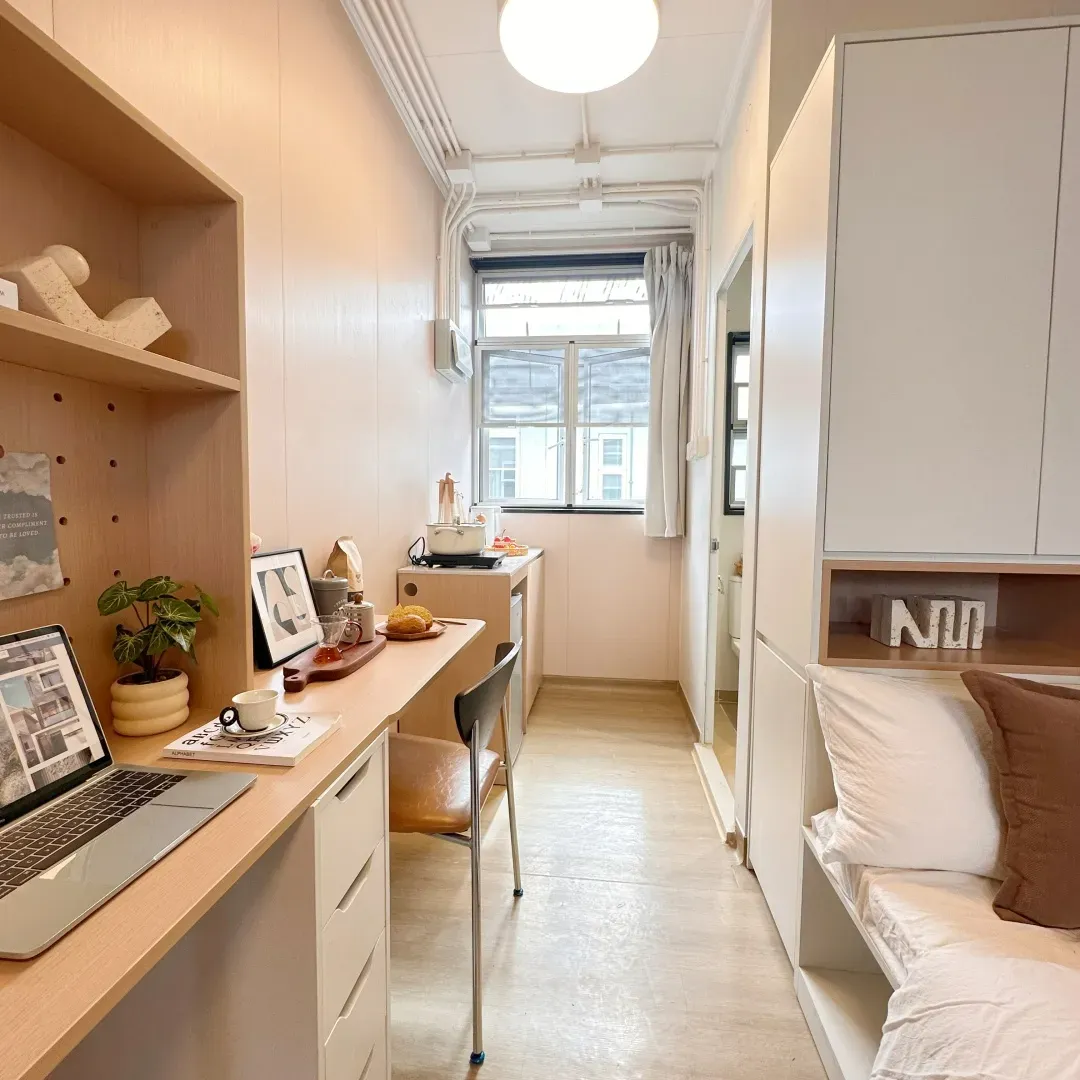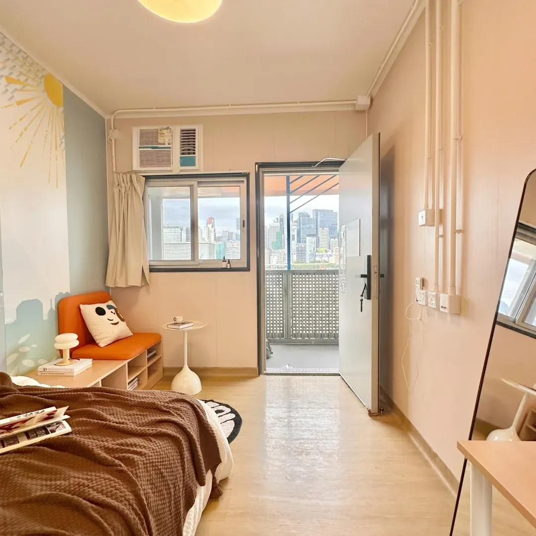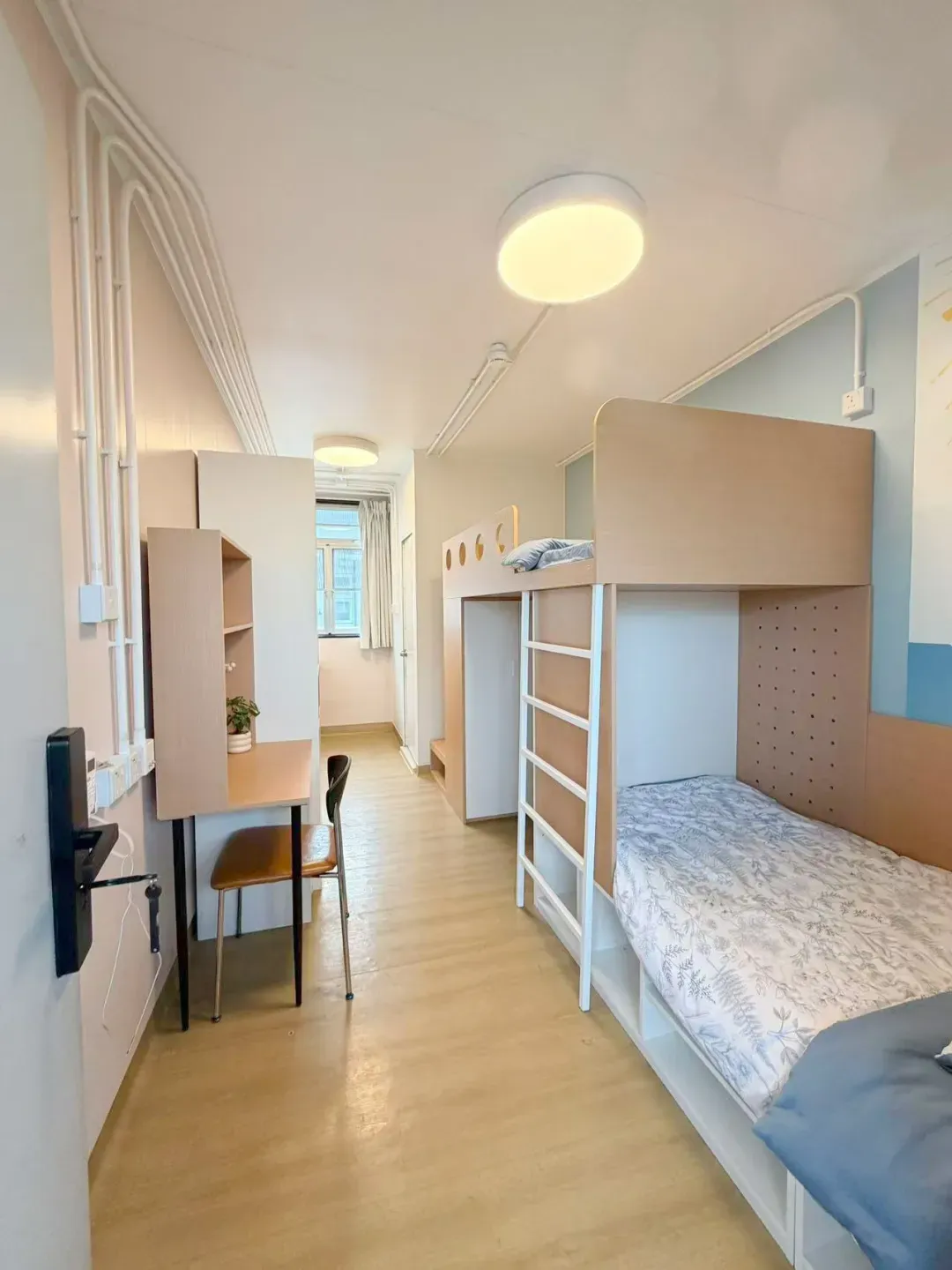 房间约14.5㎡,南北通透,配备独卫+开放式厨房:冰箱、热水壶、储物柜、热水器一应俱全,自己做饭、洗漱都不用等。收纳设计很贴心齐全,还有专门放置行李箱的收纳空间,长住的行李杂物全能放下。单人间配备小客厅,双人间有上下床 / 落地床可供学生选择。园区配有免费接驳巴士,可直达启德站。公寓紧邻启德游轮码头,不仅能欣赏海景,还能观赏CBD夜景,周边更有海滨步道、运动场地、宠物公园等,未来还将建成多个演艺空间与商业区。平时会举办艺术节、市集、音乐会等活动,在忙碌的学习和工作之余也能放松身心。