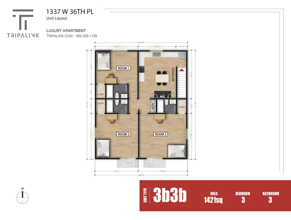 公寓以高品质建造标准和全面的居住保障为核心优势,所有单元均配备全套家具,无需学生额外购置。户型以 3 卧 3 卫为主,满足 2-6 人(每间卧室最多 2 人)的居住需求,额外增加租户需每月支付 100 美元费用。水电费按每人每月 100 美元固定费率收取,其中已包含网费;停车方面,可选择双人车位(每月 125-150 美元)或单人车位(每月 125-175 美元),均无需缴纳许可证押金,且允许携带情感支持动物(ESA)和服务动物。公寓还提供 24 小时在线门户,方便租户随时缴纳租金或反馈居住问题。