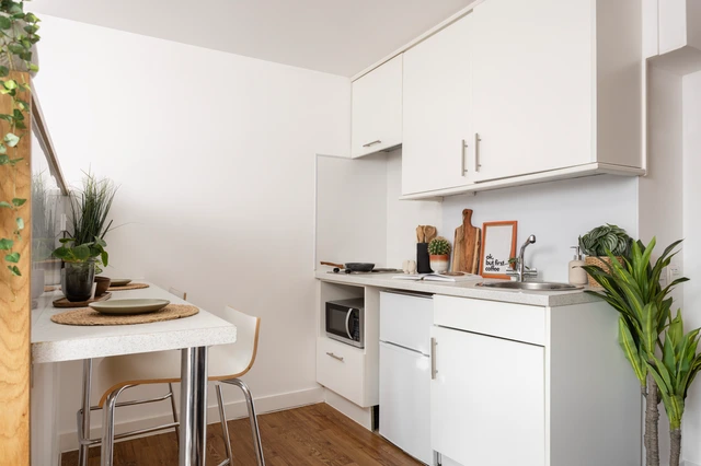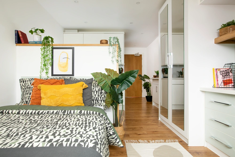 房间内部:每间房均配备英国标准小双人床、书桌椅、衣柜,储物空间充足,窗户可开启,通风良好。Ensuite房型多为5-6人间,适合与好友共同居住;Studio则拥有独立厨房与卫浴,满足偏好私密生活的学生。