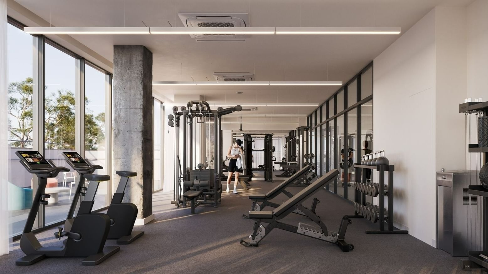 健身设施:24 小时开放的设备齐全健身房,内有 cardio 器械、举重架、自由重量器械及宽敞活动空间,还可使用户外庭院,运动时能呼吸新鲜空气。