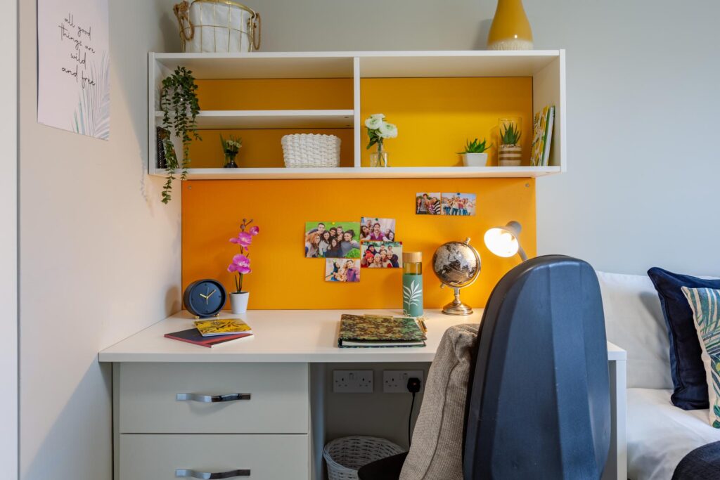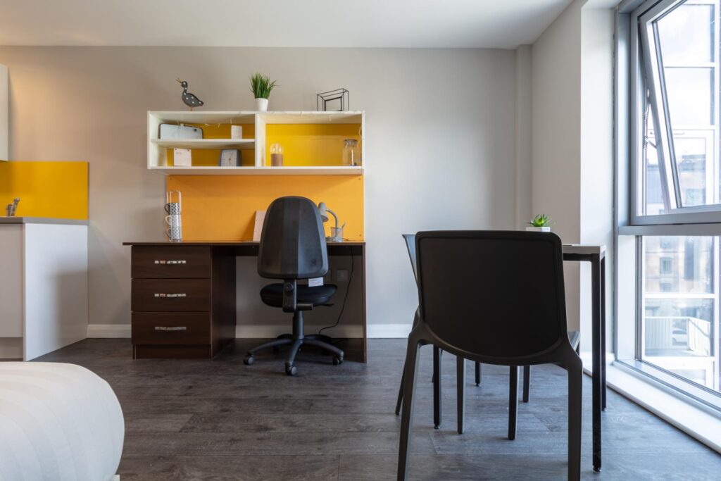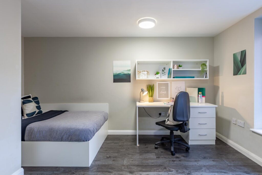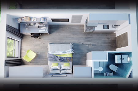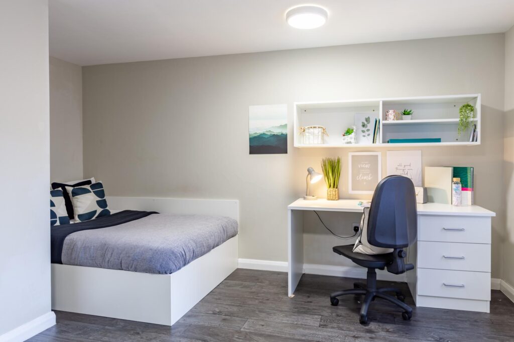 公寓提供Ensuite和Studio 房型。ensuite 房型独立卫浴、共用厨房,该公寓多为6人间,是喜欢社交的学生的最佳选择;Studio房型独立卫浴、独立厨房,为学生提供更私密和自在的个人空间。 房间配有双人床、书桌椅、衣柜、穿衣镜等,有充足的储物空间。厨房配有灶台、冰箱、烤箱等。