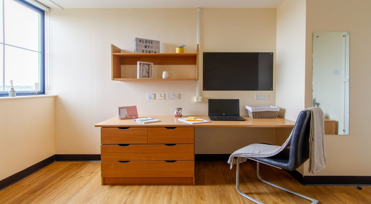 带桌椅的专属学习区(放得下笔记本 + 专业课本),学习休息都舒服。更绝的是全楼覆盖 1Gbps 高速 WiFi,线上上课、Zoom 小组讨论、和家人视频都不卡,追剧刷视频更是丝滑;