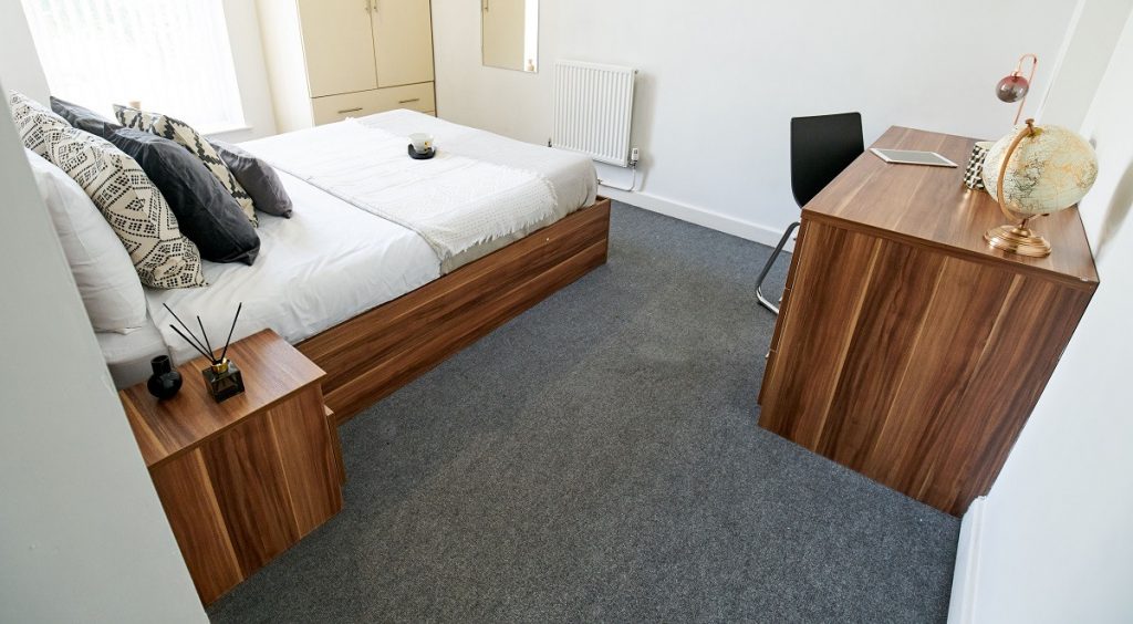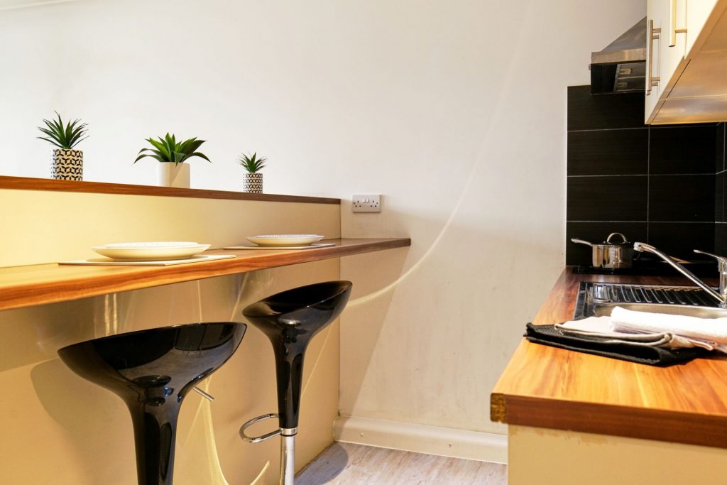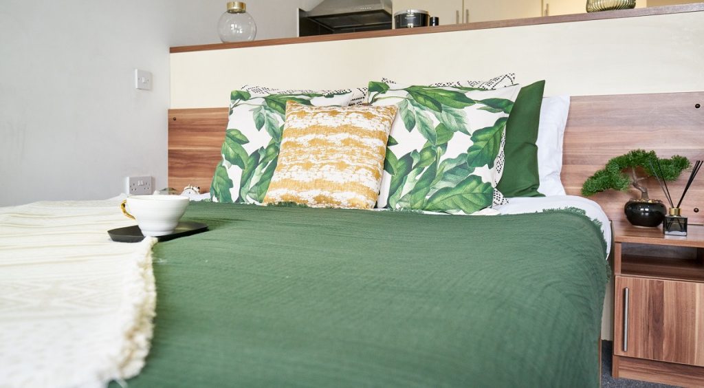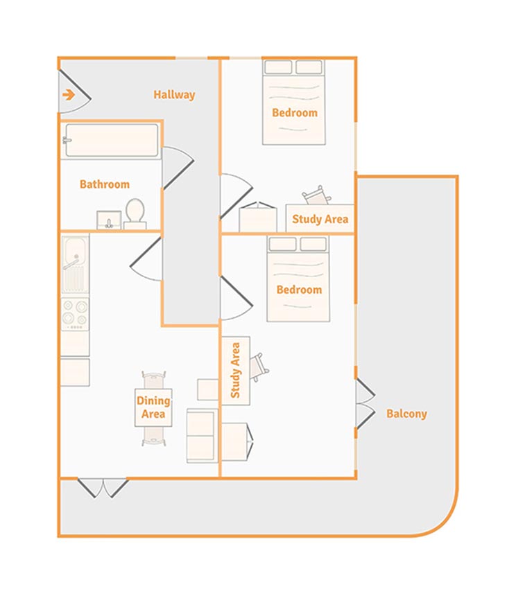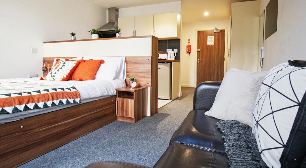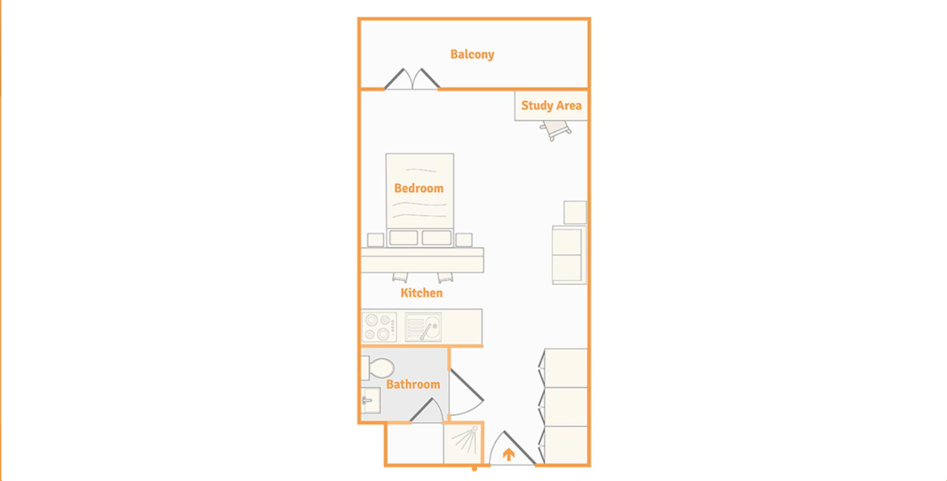 房间内部:提供2b和Studio房型,配备齐全,装修精良。每间公寓都拥有宽敞舒适的大床、带淋浴的独立卫浴以及时尚且设备齐全的厨房。部分学生公寓还设有可俯瞰城市美景的私人阳台。